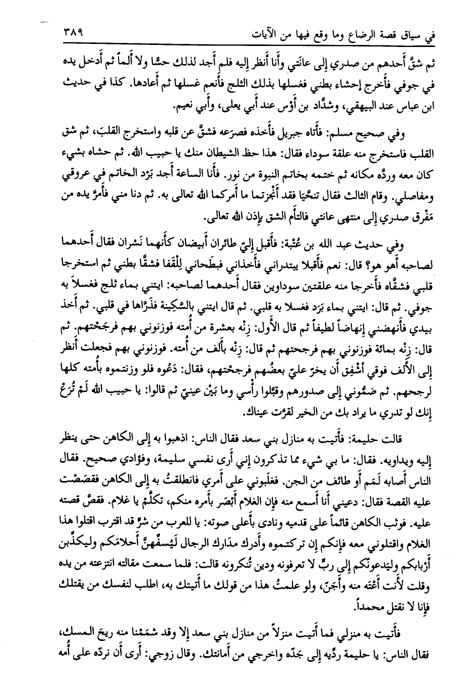 وفي حديث عبد الله بن عتبة: فأقبل إلي طائران أبيضان كأنهما نسران فقال أحدهما لصاحبه أهو هو؟ قال: نعم فأقبلا يبتدراني فأخذاني فبطحاني للقفا فشقا بطني ثم استخرجا قلبي فشقاه فأخرجا منه علقتين سوداوين فقال أحدهما لصاحبه: إيتني بماء ثلج فغسلا به جوفي. ثم قال: إيتني بماء برد فغسلا به قلبي. ثم قال إيتني بالسكينة فذراها في قلبي. ثم أخذ بيدي فأنهضني إنهاضاً لطيفاً ثم قال الأول: زنه بعشرة من أمته فوزنوني بهم فرجحتهم. ثم قال: زنه بمائة فوزنوني بهم فرجحتهم ثم قال: زنه بألف من أمته. فوزنوني بهم فجعلت أنظر إلى الألف فوقي أشفق أن يخرّ عليّ بعضهم فرجحتهم، فقال: دعوه فلو وزنتموه بأمته كلها لرجحهم. ثم ضمّوني إلى صدورهم وقبّلوا رأسي وما بين عينيّ ثم قالوا: يا حبيب الله لم ترع إنك لو تدري ما يراد بك من الخير لقرّت عيناك.