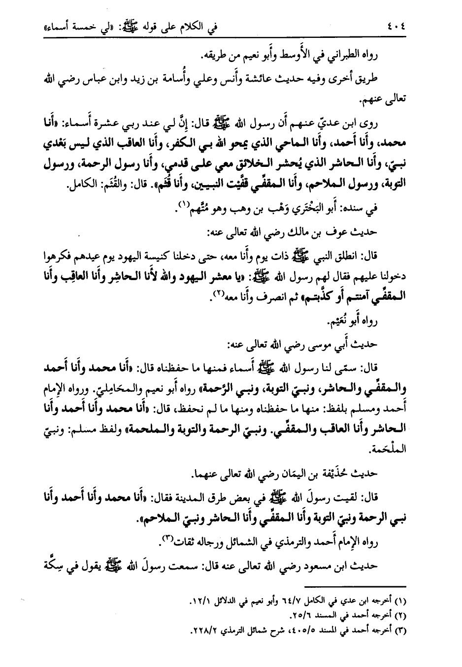 قال: لقيت رسول الله صلى الله عليه وسلم في بعض طرق المدينة فقال: «أنا محمد وإنا أحمد وأنا نبيّ الرحمة ونبيّ التوبة وأنا المقفّي وأنا الحاشر ونبيّ الملاحم» .