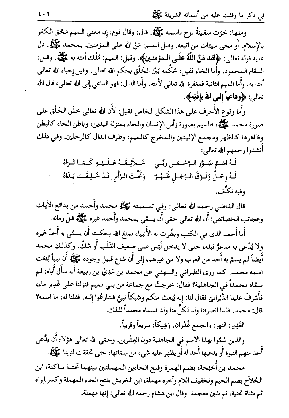 قال القاضي رحمه الله تعالى: وفي تسميته صلى الله عليه وسلم محمد وأحمد من بدائع الآيات وعجائب الخصائص: أن الله تعالى حمى أن يسمّى بمحمد وأحمد غيره صلى الله عليه وسلم قبل زمانه.