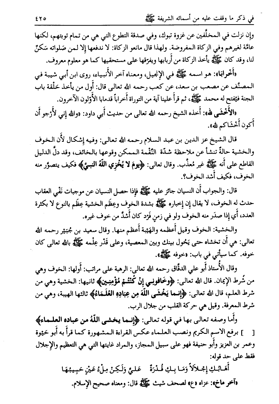 وأما وصفه تعالى بها في قوله تعالى: إِنَّما يَخْشَى اللَّهَ مِنْ عِبادِهِ الْعُلَماءُ [] برفع الاسم الكريم ونصب العلماء عكس القراءة المشهورة كما قرأ به أبو حيوة وعمر بن العزيز وأبو حنيفة فهو على سبيل المجاز، والمراد غايتها التي هي التعظيم والإجلال فقط على حد قوله: