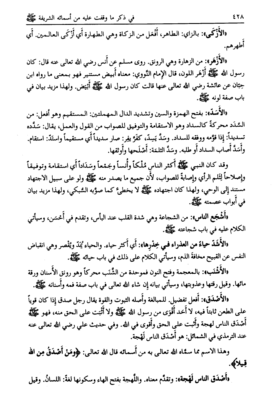 من الزهارة وهي الرونق. روى مسلم عن أنس رضي الله تعالى عنه قال: كان رسول الله صلى الله عليه وسلم أزهر اللون، قال الإمام النووي: معناه أبيض مستنير فهو بمعنى ما رواه ابن حبان عن عائشة رضي الله تعالى عنها قالت كان رسول الله صلى الله عليه وسلم أبيض. ولهذا مزيد بيان في باب صفة لونه صلى الله عليه وسلم