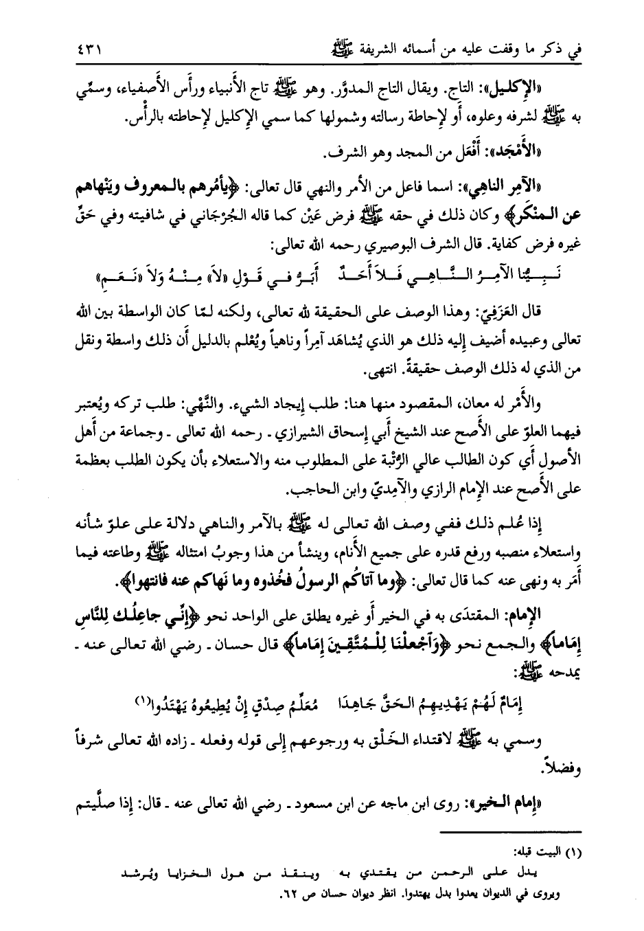 [ (1) ] وسمي به صلى الله عليه وسلم لاقتداء الخلق به ورجوعهم إلى قوله وفعله- زاده الله تعالى شرفا وفضلاً