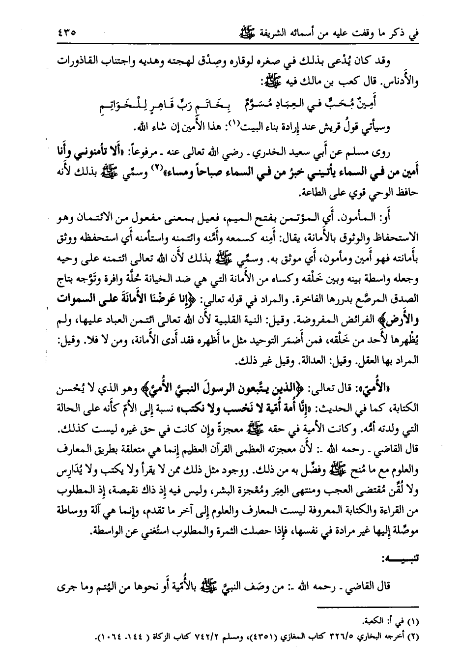 قال القاضي- رحمه الله-: من وصف النبي صلى الله عليه وسلم بالأمّية أو نحوها من اليتم وما جرى