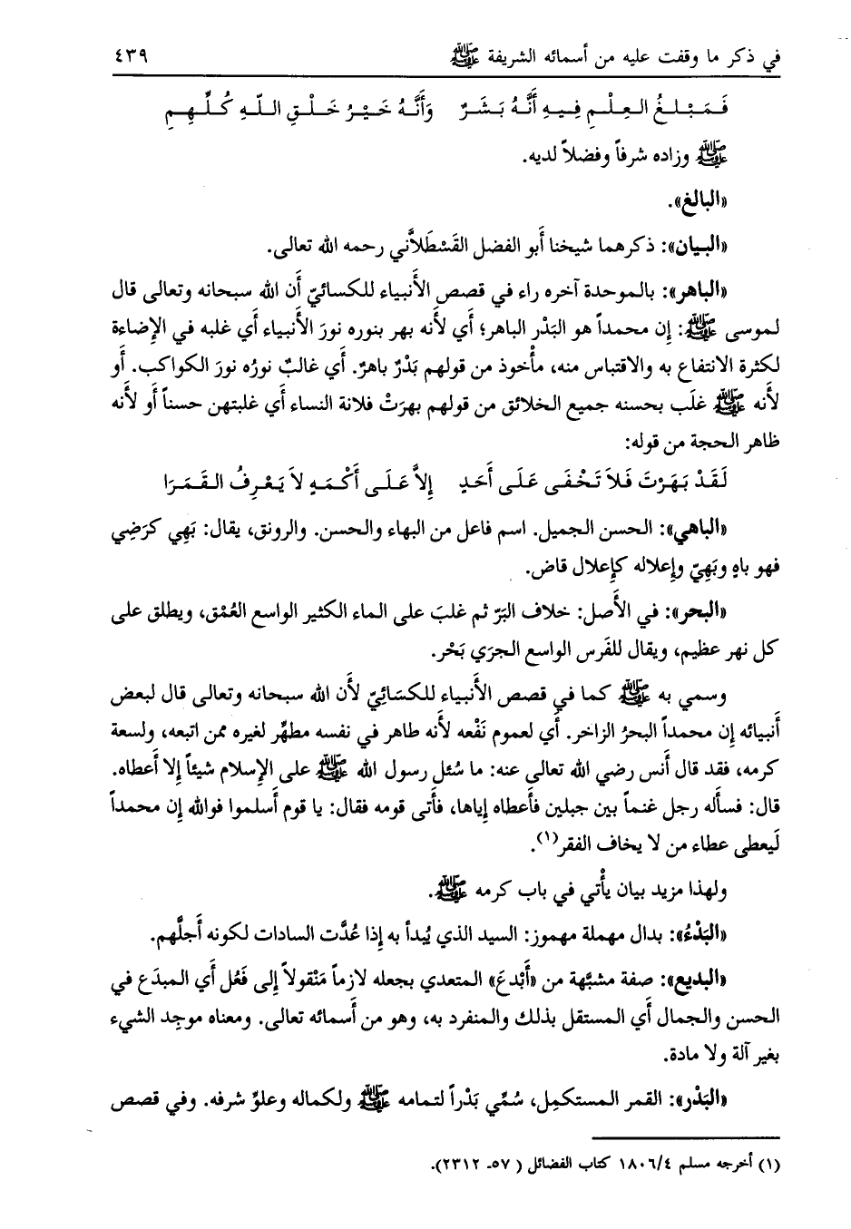 بالموحدة آخره راء في قصص الأنبياء للكسائيّ أن الله سبحانه وتعالى قال لموسى صلّى الله عليه وسلم: إن محمداً هو البدر الباهر، أي لأنه بهر بنوره نور الأنبياء أي غلبه في الإضاءة لكثرة الانتفاع به والاقتباس منه، مأخوذ من قولهم بدرٌ باهرٌ أي غالب نوره نور الكواكب أو لأنه صلى الله عليه وسلم غلب بحسنه جميع الخلائق من قولهم بهرت فلانة النساء أي غلبتهن حسناً أو لأنه ظاهر الحجة من قوله: