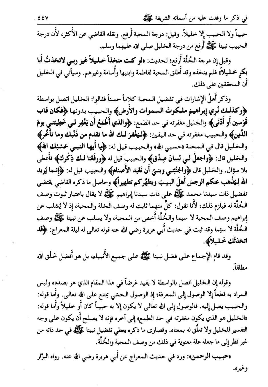 «الخليل هو الذي يكون مغفرته في حد الطمع» إلى آخره فإنه لا يصلح أن يكون على وجه التفسير للخليل ولا تعلّق له بمعناه. وقصارى ما ذكره يعطي تفضيل نبينا صلى الله عليه وسلم في حد ذاته من غير نظر إلى ما جعله علة معنوية في ذلك من وصف المحبة والخلّة.