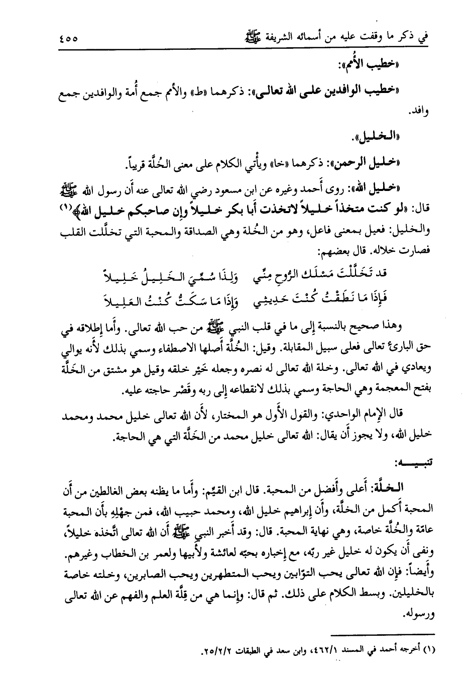 [ (1) ] والخليل: فعيل بمعنى فاعل، وهو من الخلة وهي الصداقة والمحبة التي تخلّلت القلب فصارت خلاله. قال بعضهم: