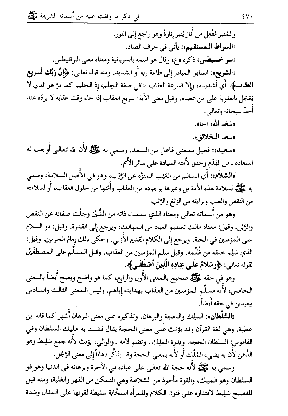 وسمي به صلى الله عليه وسلم لأنه حجة الله تعالى علي عباده في الآخرة وبرهانه في الدنيا وهو ذو السلطان وهو الملك، والقوة مأخوذ من السّلاطة وهي التمكن من القهر والغلبة، ومنه قيل للفصيح سليط لاقتداره على فنون الكلام وللمرأة السّخاية سليطة لقوتها على المقال وشدة