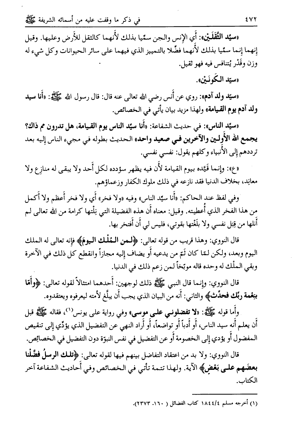 «ع» : وإنما قيّده بيوم القيامة لأن فيه يظهر سؤدده لكل أحد ولا يبقى له منازع ولا معاند، بخلاف الدنيا فقد نازعه في ذلك ملوك الكفار وزعماؤهم.
