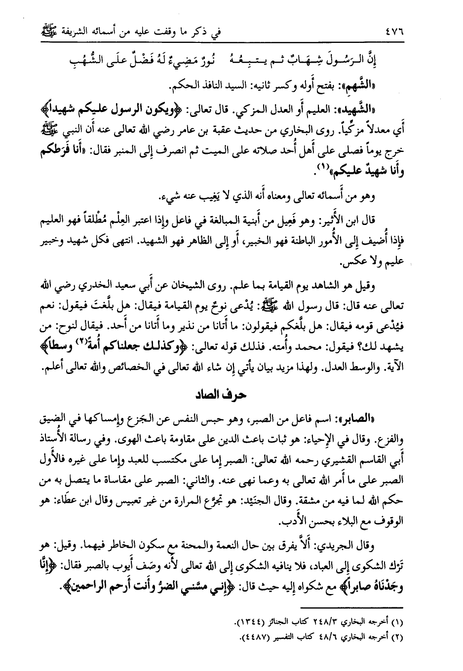 العليم أو العدل المزكي. قال تعالى: وَيَكُونَ الرَّسُولُ عَلَيْكُمْ شَهِيداً أي معدلاً مزكّياً.