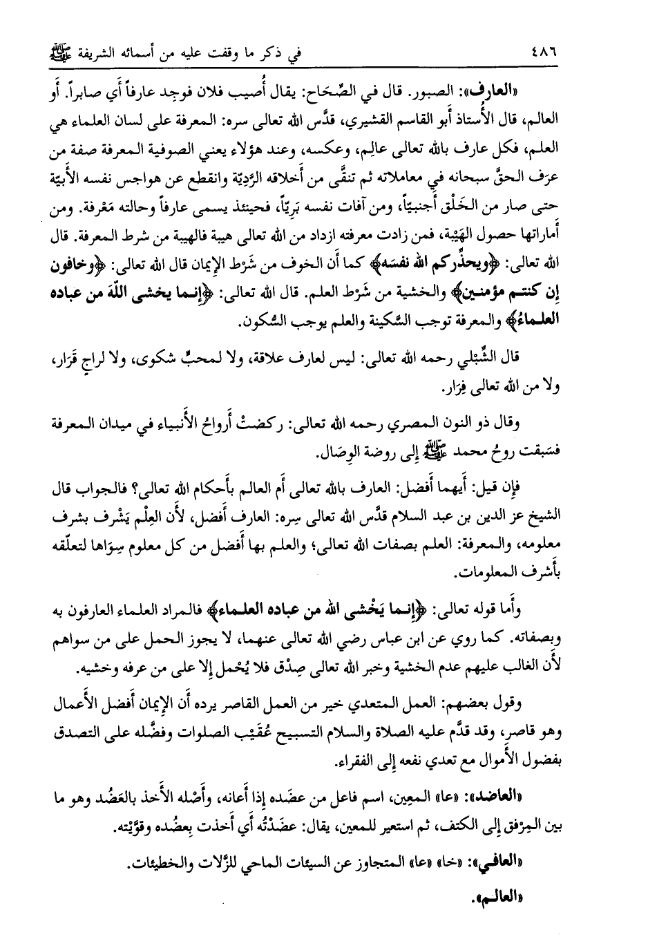 الصبور. قال في الصحاح: يقال أصيب فلان فوجد عارفاً أي صابراً. أو العالم، قال الأستاذ أبو القاسم القشيري، قدّس الله تعالى سره: المعرفة على لسان العلماء هي العلم، فكل عارف بالله تعالى عالم، وعكسه، وعند هؤلاء يعني الصوفية المعرفة صفة من عرف الحقّ سبحانه في معاملاته ثم تنقى من أخلاقه الرّديّة وانقطع عن هواجس نفسه الأبية حتى صار من الخلق أجنبيّاً، ومن آفات نفسه برياً، فحينئذ يسمى عارفاً وحالته معرفة. ومن أماراتها حصول الهيبة، فمن زادت معرفته ازداد من الله تعالى هيبة فالهيبة من شرط المعرفة. قال الله تعالى: وَيُحَذِّرُكُمُ اللَّهُ نَفْسَهُ كما أن الخوف من شرط الإيمان قال الله تعالى: وَخافُونِ إِنْ كُنْتُمْ مُؤْمِنِينَ والخشية من شرط العلم. قال الله تعالى: إِنَّما يَخْشَى اللَّهَ مِنْ عِبادِهِ الْعُلَماءُ والمعرفة توجب السّكينة والعلم يوجب السّكون.
