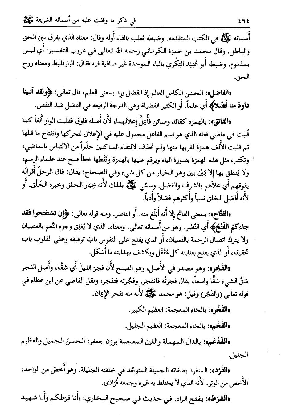 أسمائه صلى الله عليه وسلم في الكتب المتقدمة. وضبطه ثعلب بالفاء أوله وقال: معناه الذي يفرق بين الحق والباطل. وقال محمد بن حمزة الكرماني رحمه الله تعالى في غريب التفسير: أي ليس بمذموم. وضبطه أبو عبيد البكري بالباء الموحدة غير صافية فيه فقال: البارقليط ومعناه روح الحق.
