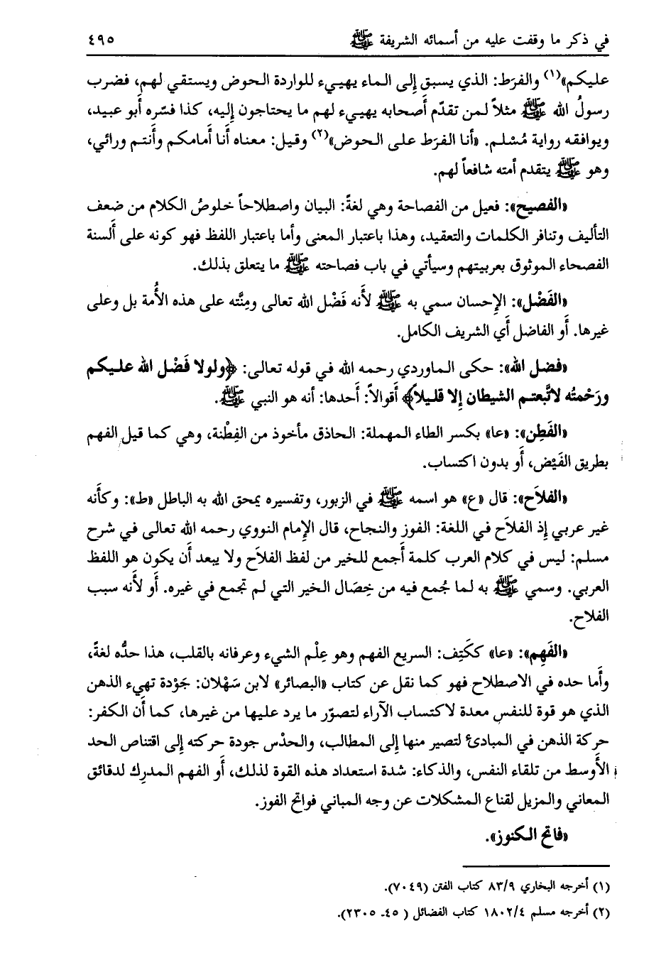 فعيل من الفصاحة وهي لغة: البيان واصطلاحا خلوص الكلام من ضعف التأليف وتنافر الكلمات والتعقيد، وهذا باعتبار المعنى وأما باعتبار اللفظ فهو كونه على ألسنة الفصحاء الموثوق بعربيتهم وسيأتي في باب فصاحته صلى الله عليه وسلم ما يتعلق بذلك.
