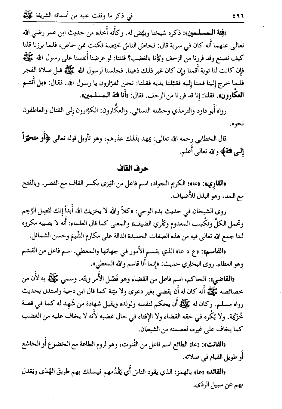 حديث ابن عمر رضي الله تعالى عنهما أنه كان في سرية قال: فحاص الناس حيصة فكنت ممن حاص، فلما برزنا قلنا كيف نصنع وقد فررنا من الزحف وبؤنا بالغضب؟ فقلنا: لو عرضنا أنفسنا على رسول الله صلى الله عليه وسلم فإن كانت لنا توبة أقمنا وإن كان غير ذلك ذهبنا. فجلسنا لرسول الله صلى الله عليه وسلم قبل صلاة الفجر فلما خرج إلينا قمنا إليه فقبّلنا يديه فقلنا: نحن الفرّارون يا رسول الله. فقال: «بل أنتم العكارون» . فقلنا: إنا قد فررنا من الزحف. فقال: «أنا فئة المسلمين» .