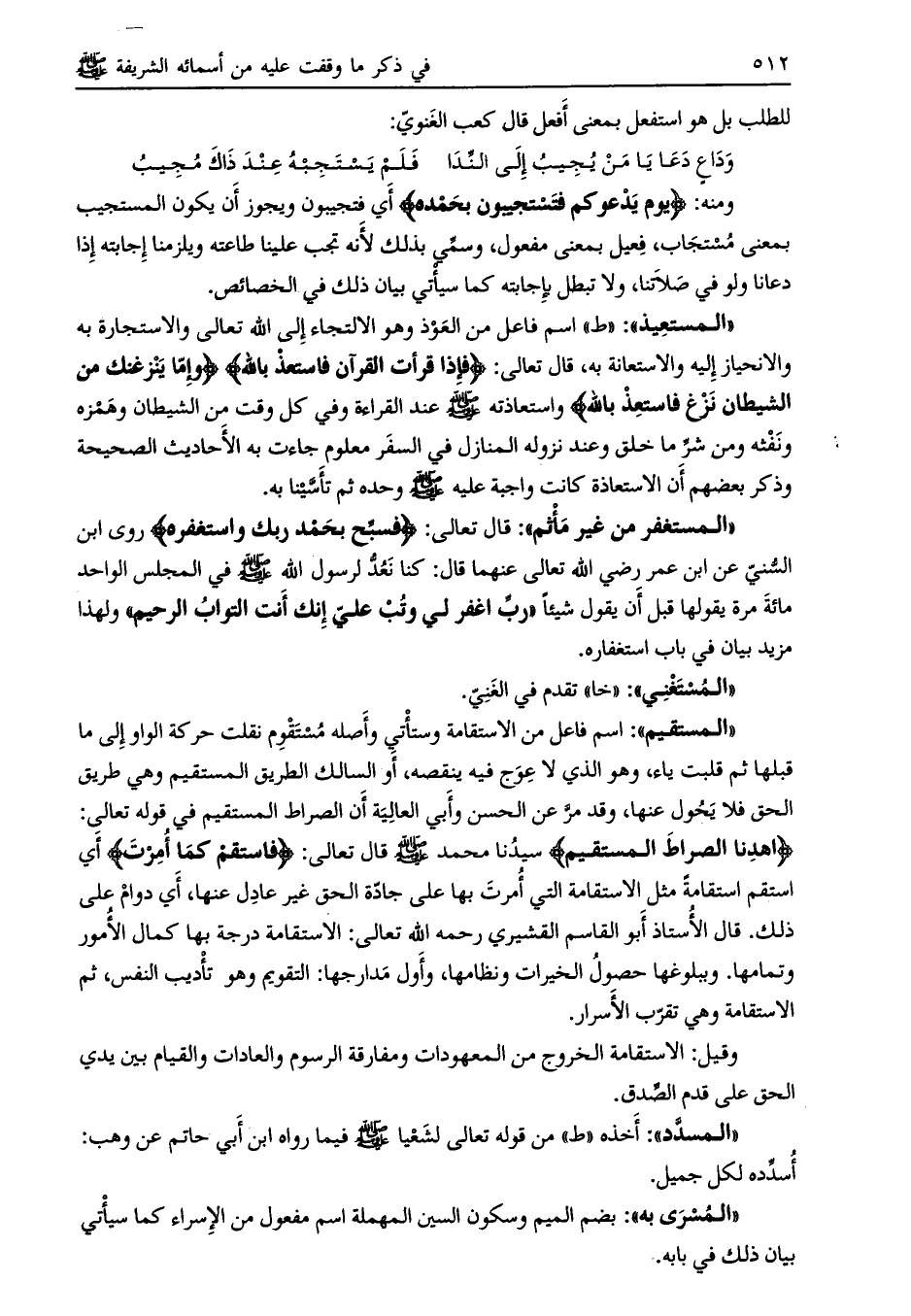 اهْدِنَا الصِّراطَ الْمُسْتَقِيمَ سيدنا محمد صلى الله عليه وسلم قال تعالى: فَاسْتَقِمْ كَما أُمِرْتَ أي استقم استقامةً مثل الاستقامة التي أمرت بها على جادّة الحق غير عادل عنها، أي دوام على ذلك. قال الأستاذ أبو القاسم القشيري رحمه الله تعالى: الاستقامة درجة بها كمال الأمور وتمامها. وببلوغها حصول الخيرات ونظامها، وأول مدارجها: التقويم وهو تأديب النفس، ثم الاستقامة وهي تقرّب الأسرار.