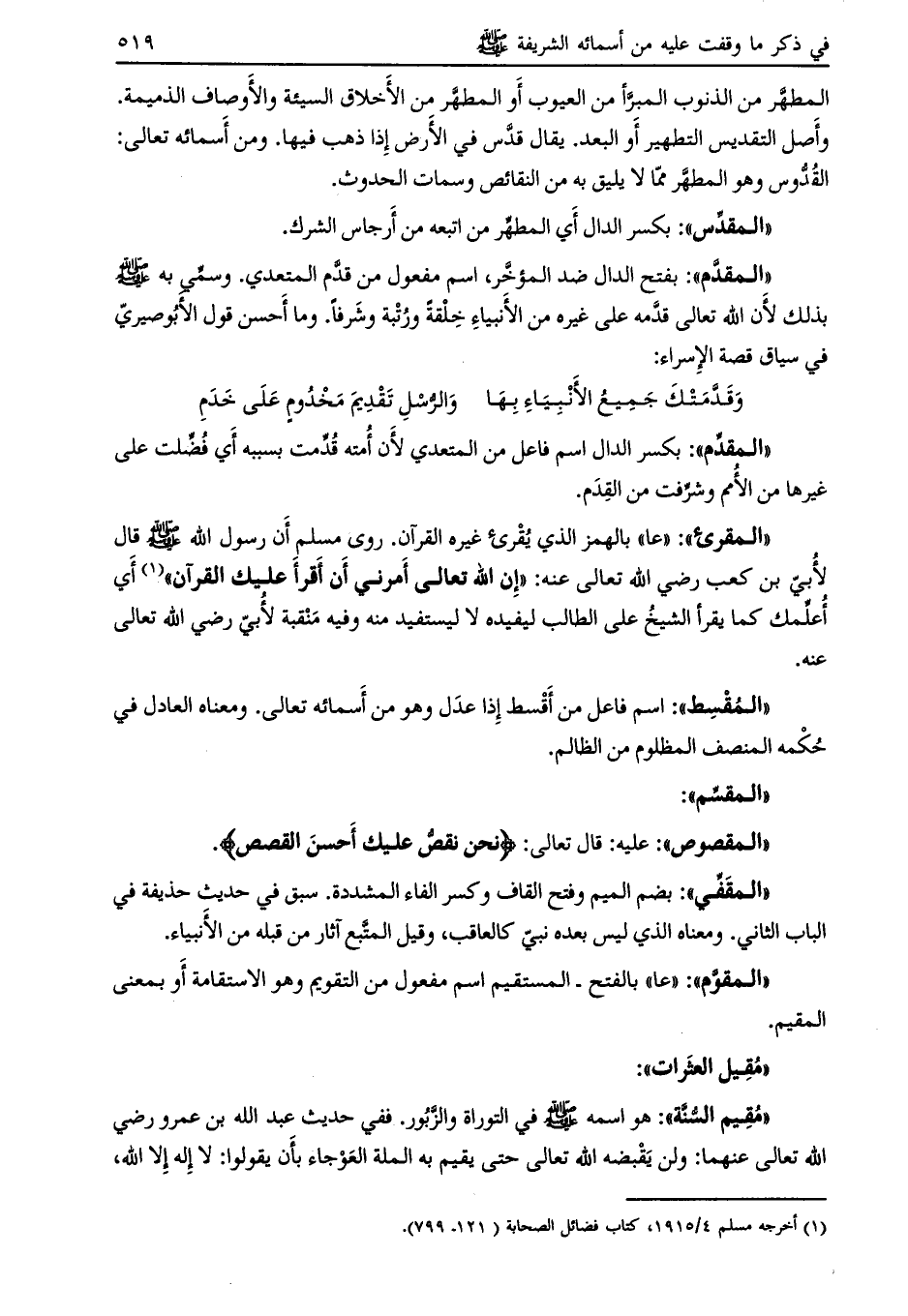 بفتح الدال ضد المؤخّر، اسم مفعول من قدّم المتعدي. وسمي به صلى الله عليه وسلّم بذلك لأن الله تعالى قدّمه على غيره من الأنبياء خلقةً ورتبة وشرفاً. وما أحسن قول الأبو صيريّ في سياق قصة الإسراء:
