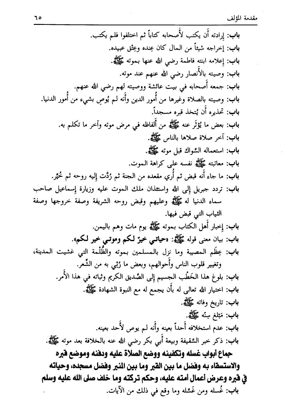جماع أبواب غسله وتكفينه ووضع الصلاة عليه ودفنه وموضع قبره والاستسقاء به وفضل ما بين القبر وما بين المنبر وفضل مسجده، وحياته في قبره وعرض أعمال أمته عليه، وحكم تركته وما خلف صلى الله عليه وسلم باب: غسله ومن غسله وما وقع في ذلك من الآيات.