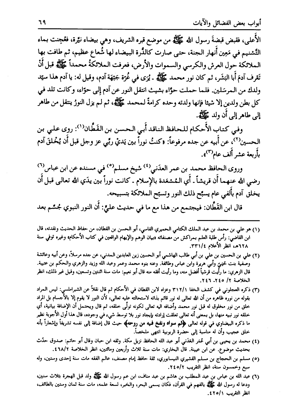 وفي كتاب الأحكام للحافظ الناقد أبي الحسن بن القطّان [ (1) ] : روى علي بن الحسين [ (2) ] ، عن أبيه عن جده مرفوعاً: «كنت نوراً بين يدي ربي عز وجل قبل أن يخلق آدم بأربعة عشر ألف عام [ (3) ] » .