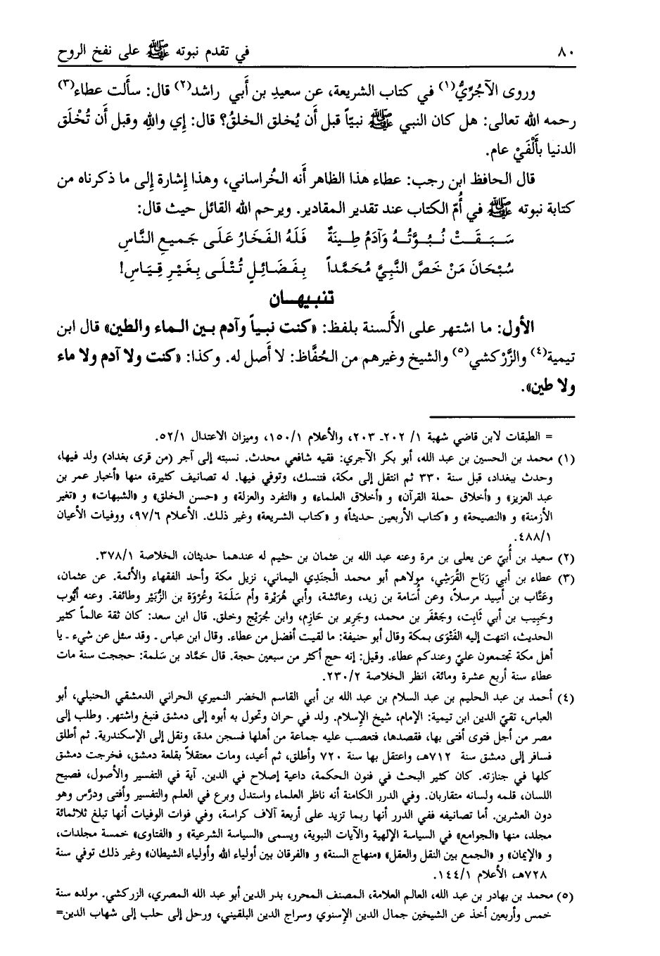 وروى الآجريّ [ (1) ] في كتاب الشريعة، عن سعيد بن أبي راشد [ (2) ] قال: سالت عطاء [ (3) ] رحمه الله تعالى: هل كان النبي صلى الله عليه وسلم نبيّاً قبل أن يخلق الخلق؟ قال: إي والله وقبل أن تخلق الدنيا بألفي عام.