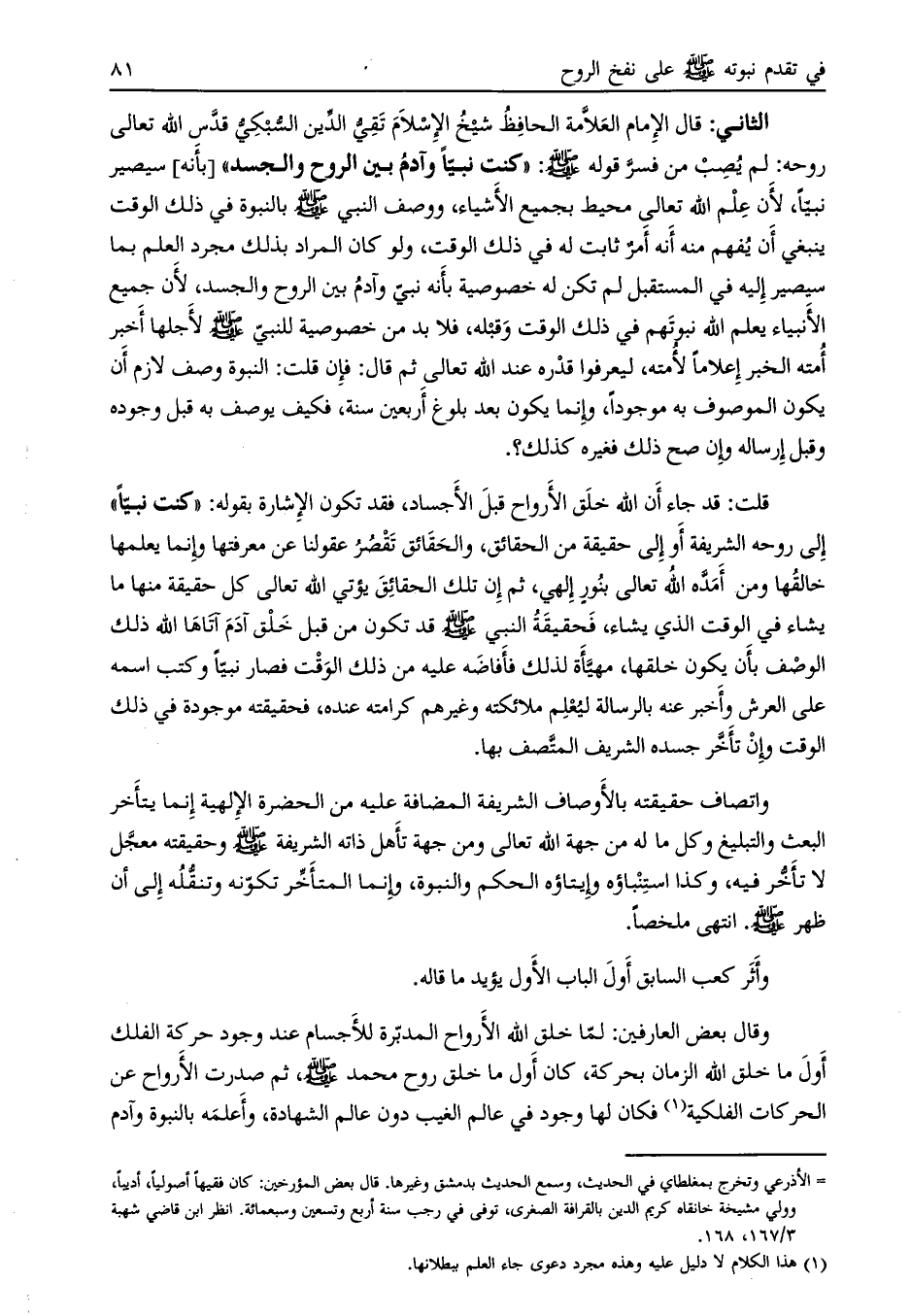 إلى روحه الشريفة أو إلى حقيقة من الحقائق، والحقائق تقصر عقولنا عن معرفتها وإنما يعلمها خالقها ومن أمده الله تعالى بنور إلهي، ثم إن تلك الحقائق يؤتي الله تعالى كل حقيقة منها ما يشاء في الوقت الذي يشاء، فحقيقة النبي صلى الله عليه وسلم قد تكون من قبل خلق آدم آتاها الله ذلك الوصف بأن يكون خلقها، مهيّأة لذلك فأفاضه عليه من ذلك الوقت فصار نبيّاً وكتب اسمه على العرش وأخبر عنه بالرسالة ليعلم ملائكته وغيرهم كرامته عنده، فحقيقته موجودة في ذلك الوقت وإن تأخّر جسده الشريف المتّصف بها.