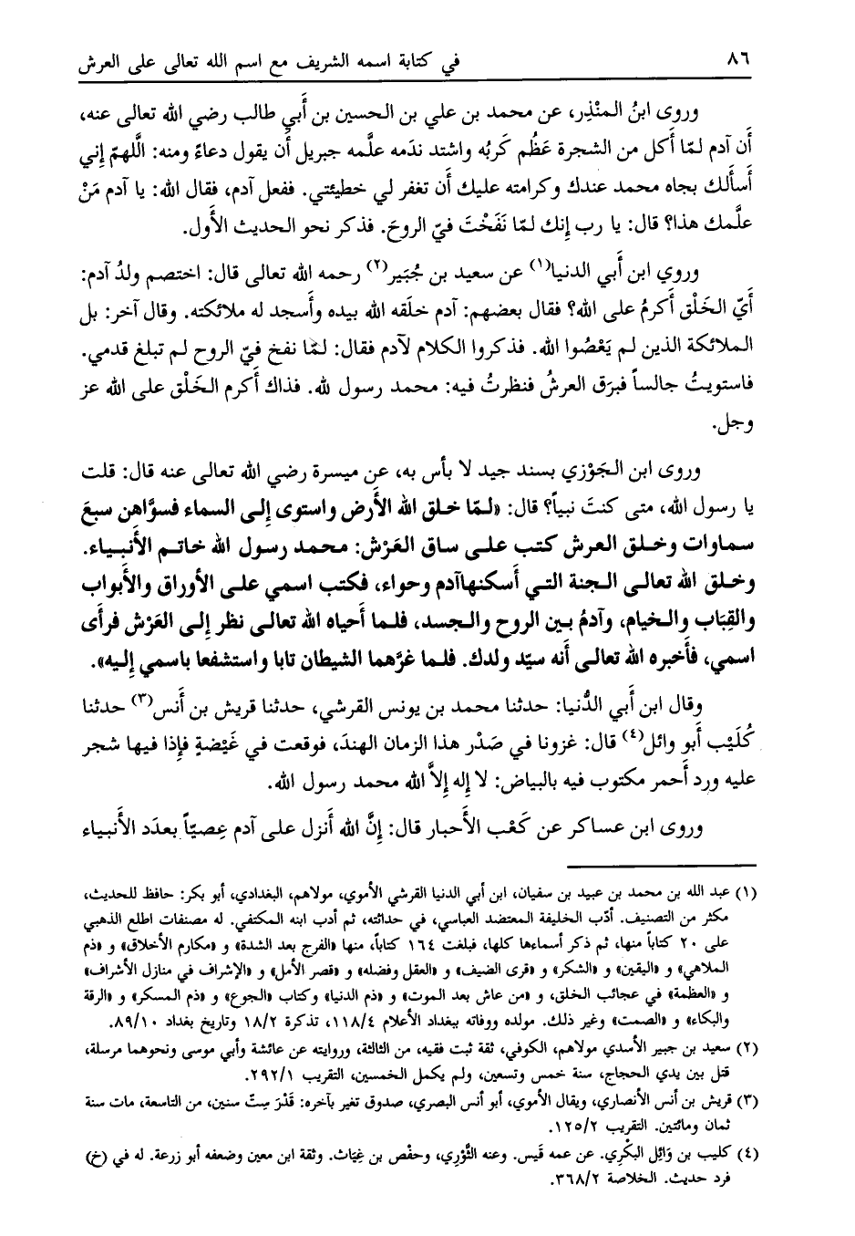 وخلق الله تعالى الجنة التي أسكنها آدم وحواء، فكتب اسمي على الأوراق والأبواب والقباب والخيام، وآدم بين الروح والجسد، فلما أحياه الله تعالى نظر إلى العرش فرأى اسمي، فأخبره الله تعالى إنه سيّد ولدك. فلما غرّهما الشيطان تابا واستشفعا باسمي إليه» .