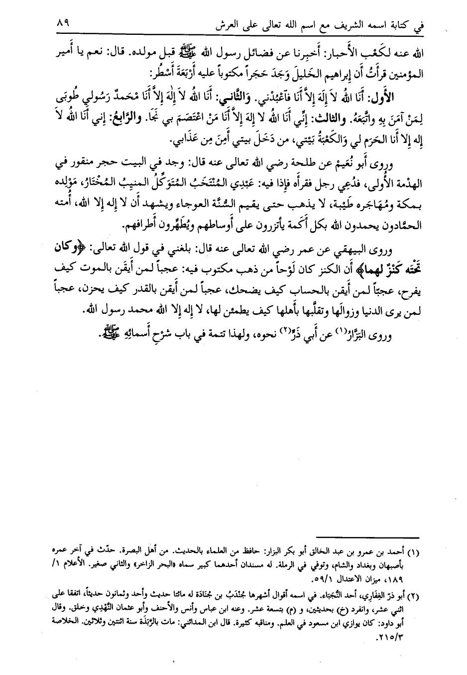 وروى البيهقي عن عمر رضي الله تعالى عنه قال: بلغني في قول الله تعالى: وَكانَ تَحْتَهُ كَنْزٌ لَهُما أن الكنز كان لوحاً من ذهب مكتوب فيه: عجباً لمن أيقن بالموت كيف يفرح، عجبّاً لمن أيقن بالحساب كيف يضحك، عجباً لمن أيقن بالقدر كيف يحزن، عجباً لمن يرى الدنيا وزوالها وتقلّبها بأهلها كيف يطمئن لها، لا إله إلا الله محمد رسول الله.