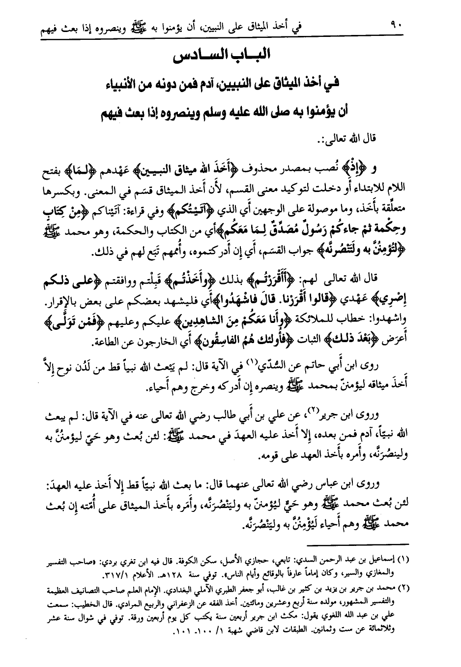 الباب السادس في أخذ الميثاق على النبيين، آدم فمن دونه من الأنبياء أن يؤمنوا به صلى الله عليه وسلّم وينصروه إذا بعث فيهم