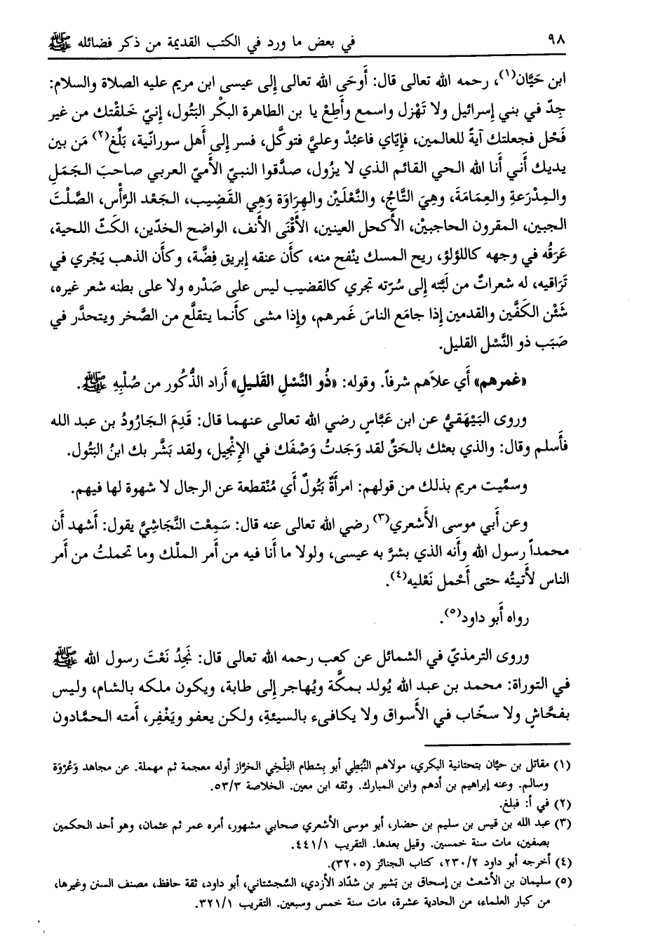 جدّ في بني إسرائيل ولا تهزل واسمع وأطع يا بن الطاهرة البكر البتول، إنيّ خلقتك من غير فحل فجعلتك آية للعالمين، فأيايّ فاعبد وعليّ فتوكّل، فسر إلى أهل سورانّية، بلّغ [ (2) ] من بين يديك أني أنا الله الحي القائم الذي لا يزول، صدّقوا النبيّ الأمّي العربي صاحب الجمل والمدرعة والعمامة، وهي التّاج، والنّعلين والهراوة وهي القضيب، الجعد الرّأس، الصلت الجبين، المقرون الحاجبين، الأكحل العينين، الأقنى الأنف، الواضح الخدّين، الكثّ اللحية، عرقه في وجهه كاللؤلؤ، ريح المسك ينفح منه، كأن عنقه إبريق فضّة، وكأن الذهب يجري في تراقيه، له شعرات من لبته إلى سرته تجري كالقضيب ليس على صدره ولا على بطنه شعر غيره، شئن الكفّين والقدمين إذا جامع الناس غمرهم، وإذا مشى كأنما يتقلّع من الصّخر ويتحدّر في صبب ذو النّسل القليل.