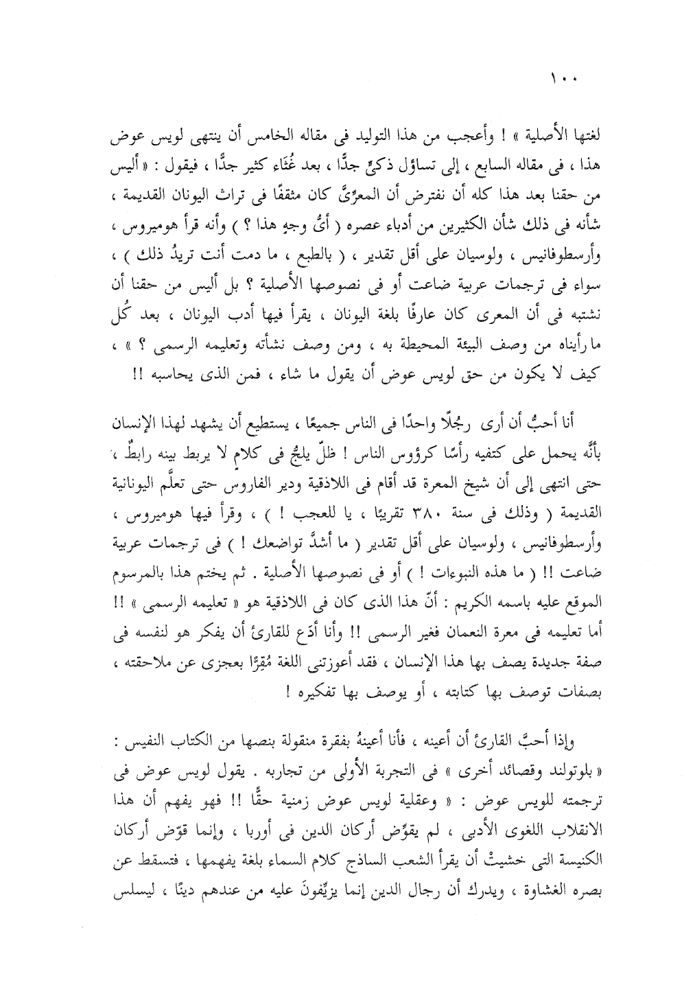 لغتها الأصلية! وأعجب من هذا التوليد في مقاله الخامس أن ينتهي لوييس عوض هذا في مقاله السابع إلى تساؤل ذكي جدا بعد غثاء كثير جدا فيقول أليس من حقنا بعد هذا كله أن نفترض أن المعري كان مثقفا في تراث اليونان القديمة شأنه في ذلك شأن الكثيرين من أدباء عصره أي وجه هذا وأنه قرأ هوميروس وأرسطوفانيس ولوسيان على أقل تقدير بالطبع ما دمت أنت تريد ذلك سواء في ترجمات عربية ضاعت أو في نصوصها الأصلية بل أليس من حقنا أن نشتبه في أن المعري كان عارفا بلغة اليونان يقرأ فيها أدب اليونان بعد كل ما رأيناه من وصف البيئة المحيطة به ومن وصف نشأته وتعليمه الرسمي كيف لا يكون من حق لويس عوض أن يقول ما شاء فمن الذي يحاسبه!!