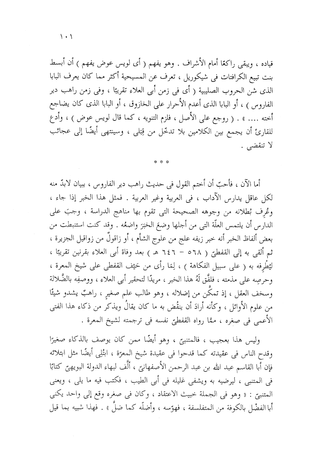 أما الآن فأحب أن أختم القول في حديث راهب دير الفاروس ببيان لابد منه لكن عاقل يدارس الآداب في العربية وغير العربية فمثل هذا الخبر إذا جاء وعرف بطلانه من وجوهه الصحيحة التي تقوم بها مناهج الدراسة وجب على الدارس أن يلتمس العلة التي من أجلها وضع الخبر واضعه وقد كنت استنبطت من بعض ألفاظ الخبر أنه خبر زيفه علج من علوج الشام أو زاقول من زواقيل الجزيرة ثم ألقى به إلى القفطي 568 - 646 هـ بعد وفاة أبي العلاء بقرنين تقريبا ليطرفه به على سبيل الفكاهة لما رأى من حيف القفطي على شيخ المعرة وحرصه على مذمته فلفق له هذا الخبر مريدا لتحقير أبي العلاء ووصفه بالضلالة وسخف العقل إذ تمكن من إضلاله وهو طالب علم صغير راهب يشدو شيئا من علوم الأوائل وكأنه أراد أن ينقض به ما كان يقال ويذكر من ذكاء هذا الفتى الأعمى في صغره مما رواه القفطي نفسه في ترجمته لشيخ المعرة.