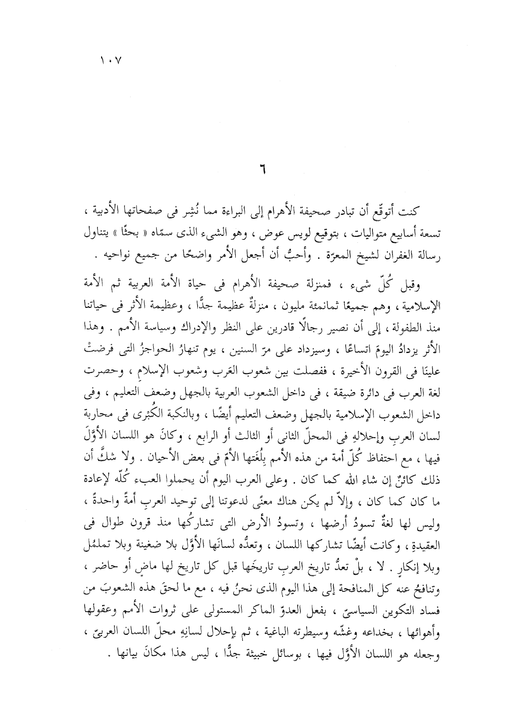 وقبل كل شيء فمنزلة صحيفة الأهرام في حياة الأم العربية ثم الأمة الإسلامية وهما جميعا ثمانئمة مليون منزلة عظيمة جدا وعظيمة الأثر في حياتنا منذ الطفولة إلى أن نصير رجالا قادرين على النظر والإدراك وسياسة الأمم وهذا الأثر يزداد اليوم اتساعا وسيزداد على مر السنين يوم تنهار الحواجز التي فرضت علينا في القرون الأخيرة ففصلت بين شعوب العرب وشعوب الإسلام وحصرت لغة العرب في دائرة ضيقة في داخل الشعوب العربية بالجهل وضعف التعليم وفي داخل الشعوب الإسلامية بالجهل وضعف التعليم أيضا وبالنكبة الكبرى في محاربة لسان العرب وإحلاله في المحل الثاني أو الثالث أو الرابع زكان هو اللسان الأول فيها مع احتفاظ كل أمة من هذه الأمم بلغتها الأم في بعض الأحيان ولا شك أن ذلك كائن إن شاء الله كما كان وعلى العرب اليوم أن يحملوا العبء كله لإعادة ما كان كما كان وإلا لم يكن هناك معنى لدعوتنا إلى توحيد العرب أمة واحدة وليس لها لغة تسود أرضها وتسود الأرض التي تشاركها منذ قرون طوال في العقيدة وكانت أيضا تشاركها اللسان وتعده لسانها الأول بلا ضغينة وبلا تململ وبلا إنكار لا بل تعد تاريخ العرب تاريخها قبل كل تاريخ لها ماض أو حاضر وتنافح عنه كل المنافحة إلى هذا اليوم الذي نحن فيه مع ما لحق هذه الشعوب من فساد التكوين السياسي بفعل العدو الماكر المستولى على ثروات الأمم وعقولها وأهوائها بخداعة وغشه وسيطرته الباغية ثم بإحلال لسانه محل اللسان العربي وجعله هو اللسان الأول فيها بوسائل خبيثة جدا ليس هذا مكان بيانها.