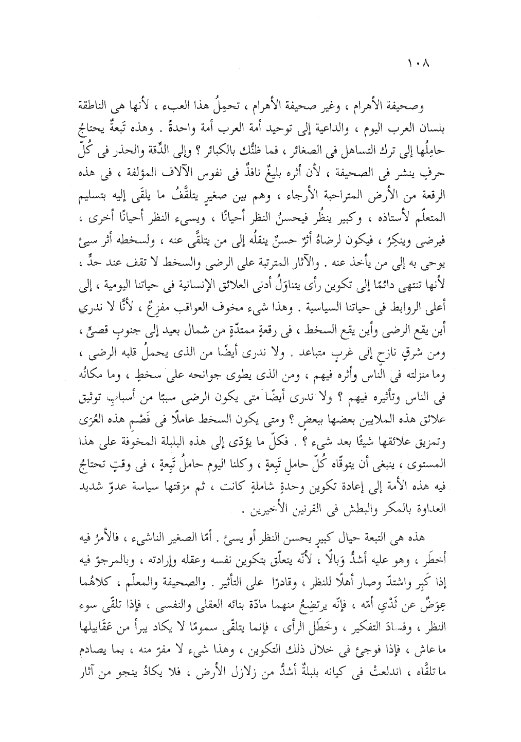 وصحيفة الأهرام وغير صحيفة الأهرام تحمل هذا العبء لأنها هي الناطقة بلسان العرب اليوم والداعية إلى توحيد أمة العرب أمة واحدة وهذه تبعة يحتاج حاملها إلى ترك التساهل في الصغائر لما ظنك بالكبائر وإلى الدقة والحذر في كل جرف ينشر في الصحيفة لأن أثره بليغ نافذ في نفوس الآلاف المؤلفة في هذه الرقعة من الأرض المتراحبة الأرجاء وهم بين صغير يتلقف ما يلقي إليه بتسليم المتعلم لأستاذه وكبير ينظر فيحسن النظر أحيانا ويسئ النظر أحيانا أخرى فيرضى وينكر فيكون لرضاه أثر حسن ينقله إلى من يتلقى عنه ولسخطه أثر سيء يوحي به إلى من يأخذ عنه والآثار المترتبة على الرضى والسخط لا تقف عند حد لنها تنتهي دائما إلى تكوين رأي يتنأول أدنى العلائق الإنسانية في حياتنا اليومية إلى أعلى الروابط في حياتنا السياسية وهذا شيء مخوف العواقب مفزع لأنا لا ندري أين يقع الرضى وأين يقع السخط في رقعة ممتدة من شمال بعيد إلى جنوب قصى ومن شرق نازح إلى غرب متباعد ولا ندري أيضا من الذي يحمل قلبه الرضى وما منزلته في الناس وأثره فيهم ومن الذي يطوي جوانحه على سخط وما مكانه في الناس وتأثيره فيهم ولا ندري أيضا متى يكون الرضى سببا من أسباب توثيق علائق هذه الملايين بعضها ببعض ومتى يكون السخط عاملا في فصم هذه المعرى وتمزيق علائقها شيئا بعد شيء فكل ما يؤدي إلى هذه البلبلة المخوفة على هذا المستوى ينبغي أن يتوفاه كل حامل تبعه وكلنا اليوم حامل تبعة في وقت تحتاج فيه هذه الأمة إلى إعادة تكوين وحدة شاملة كانت ثم مزقتها سياسة عدو شديد العداوة بالمكر والبطش في القرنين الأخيرين.