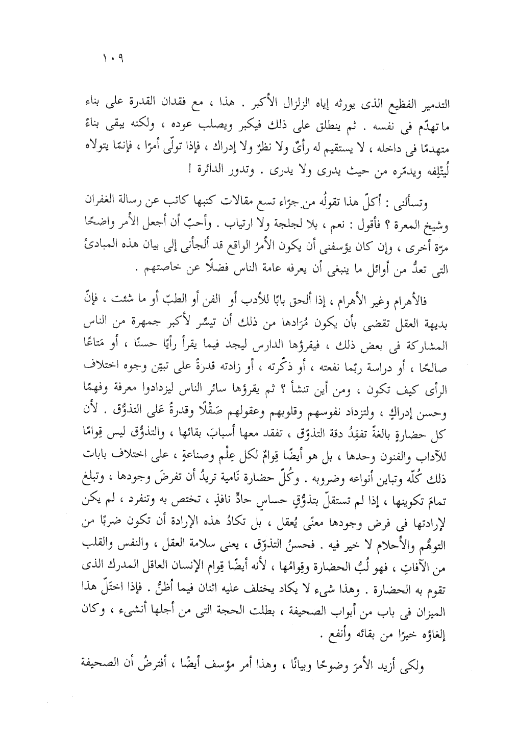 وتسألني: أكل هذا تقوله من جراء تسع مقالات كتبها كاتب عن رسالة الغفران وشيخ المعرة فأقول نعم بلا لجلجلة ولا ارتياب وأحب أن أجعل الأمر واضحا مرة أخرى وإن كان يؤسفني أن يكون الأمر الواقع قد ألجاني إلى بيان هذه المبادئ التي تعد من أوائل ما ينبغي أن يعرفه عامة الناس فضلا عن خاصتهم فالأهرام وغير الأهران إذا ألحق بابا للأدب أو الفن أو الطب أو ما شئت فإن بديهة العقل تقضي بأن يكون مرادها من ذلك أن تيسر لأكبر جمهرة من الناس المشاركة في بعض ذلك فيقرؤها الدارس ليجد فيما يقرأ رأيا حسنا أو متاعا صالحا أو دراسة ربما نفعته أو ذكرته أو زادته قدرة على تبين وجوه اختلاف الرأي كيف تكون ومن أين اتشأ ثم يقرؤها سائر التاس ليزدادوا معرفة وفهما وحسن إدراك ولتزداد نفوسهم وقلوبهم وعقولهم صقلا وقدرة على التذوق لأن كل حضارة بالغة تفقد دقة التذوق تفقد معها أسباب بقائها والتذوق ليس قواما للآداب والفنون وحدها بل هو أيضا قوام لكل علم وصناعة على اختلاف بابات ذلك كله وتباين أنواعه وضروبه وكل حضارة نامية تريد أن تفرض وجودها وتبلغ تمام تكوينها إذا لم تستقل بتذوق حساس حاد نافذ تختص به وتنفرد لم يكن لإرادتها في فرض وجودها معنى يعقل بل تكاد هذه الإرادة أن تكون ضربا من التوهم والأخلام لا خير فيه فحسن التذوق يعني سلامة العقل والنفس والقلب من الآفات فهو لبالحضارة وقوامها لأنه أيضا قوام افنسان العاقل المدرك الذي تقوم به الحضارة وهذا شيء لا بكاد يختلف عليه اثنان فيما أظن فإذا أختل هذا الميزتان في باب من أبواب الصحيفة بطلت الحجة التي من أجلها أنشئ وكان إلغاؤه خيرا من بقائه وأنفع.