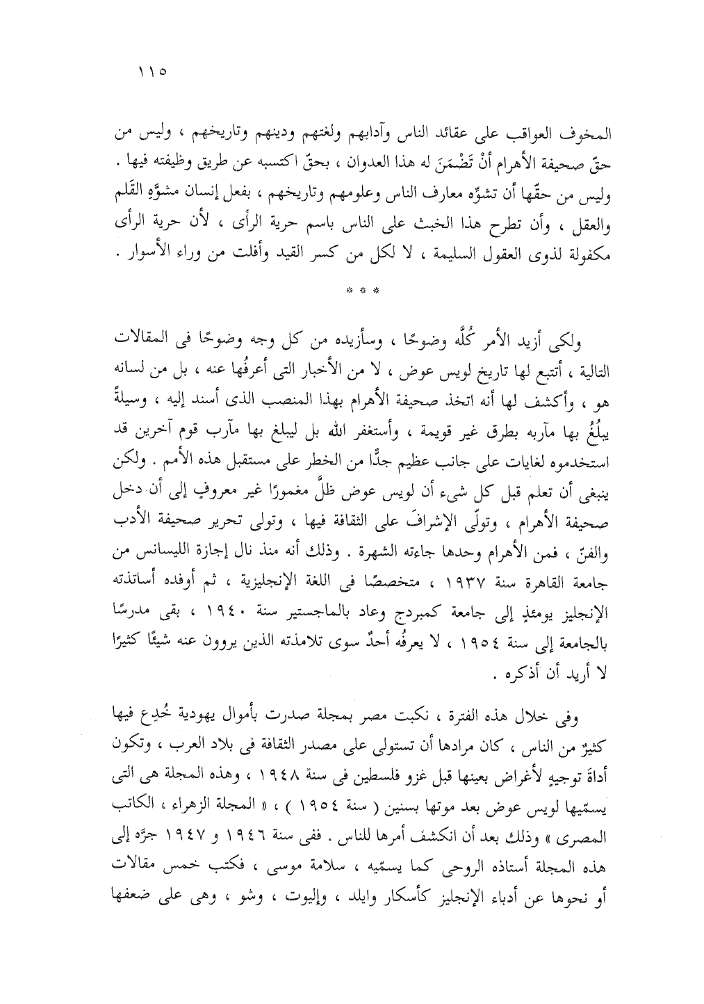 ولكي أزيد الأمر كله وضوحا وسأزيده من كل وجه وضوحا في المقالات التالية أتتبه لها تاريخ لويس عوض لا من الأخبار التي أعرفها عنه بل من لسانه هو وأكشف لها أنه اتخذ صحيفة الأهرام بهذا المنصب الذي أسند إليه وسيلة يبلغ بها مآربه بطرق غير قويمة وأستغفر الله بل ليبلغ بها مآرب قوم آخرين قد استخدموه لغايات على جانب عظيم جدا من الخطر على مستقبل هذه الأمم ولكن ينبغي أن تعلم قبل كل شيء أو لويس عوض ظل مغمورا غير معروف إلى أن دخل صحيفة الأهرام وتولى الإشراف على الثقافة فيها وتولى تحرير صحيفة الأدب والفن فمن الأهرام وحدها جاءته الشهرة وذلك أنه منذ نال إجازة الليسانس من جامعة القاهرة سنة 1937 متخصصا في اللغة الإنجليزية ثم أوفده أساتذته الإنجليز يومئذ إلى جامعة كمبردج وعاد بالماجستير سنة 1940، بقى مدرسا بالجامعة إلى سنة 1954، لا يعرفه أحد سوى تلامذته الذين يروون عنه شيئا كثيرا لا أريد أن أذكره.