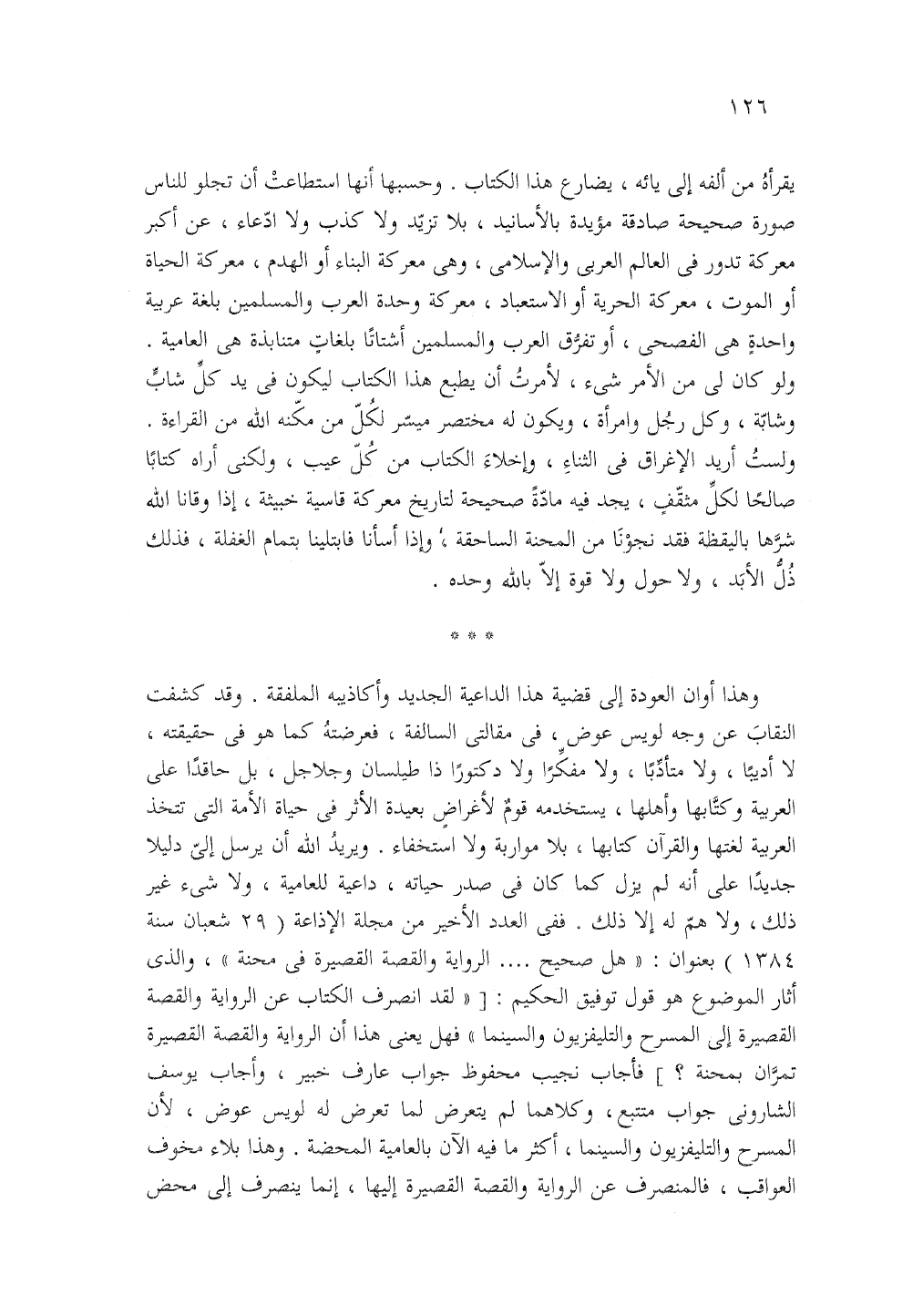 يقرأه من ألفه إلى يائه يضارع هذا الكتاب وحسبها أنها استطاعت أن تجلو للناس صورة صحيحة صادقة مؤيدة بالأسانيد بلا تزيد ولا كذب ولا إدعاء عن أكبر معركة تدور في العالم العربي والإسلامي وهي معركة البناء أو الهدم معركة الحياة أو الموت معركة الحرية أو الاستبعاد معركة وحدة العرب والمسلمين بلغة عربية واحدة هي الفصحى أو تفرق العرب والمسلمين أشتاتا بلغات منتابذة هي العامية ولو كان لي من الأمر شيء لأمرت أن يطبع هذا الكتاب ليكون في يد كل شاب وشابة وكل رجل وامرأة ويكون له مختصر ميسر لكل من مكنه الله من القراءة ولست أريد الإغراق في الثناء وإخلاء الكتاب من كل عيب ولكني أرتاه كتابا صالحا لكل مثقف يجد فيه مادة صحيحة لتاريخ معركة قاسية خبيثة إذا وقانا الله شرها باليقظة فقد نجونا من المحنة الساحقة وإذا أسأنا فابلتلينا بتمام الغفلة فذلك ذل الأبد ولا حول ولا قوة إلا بالله وحده.