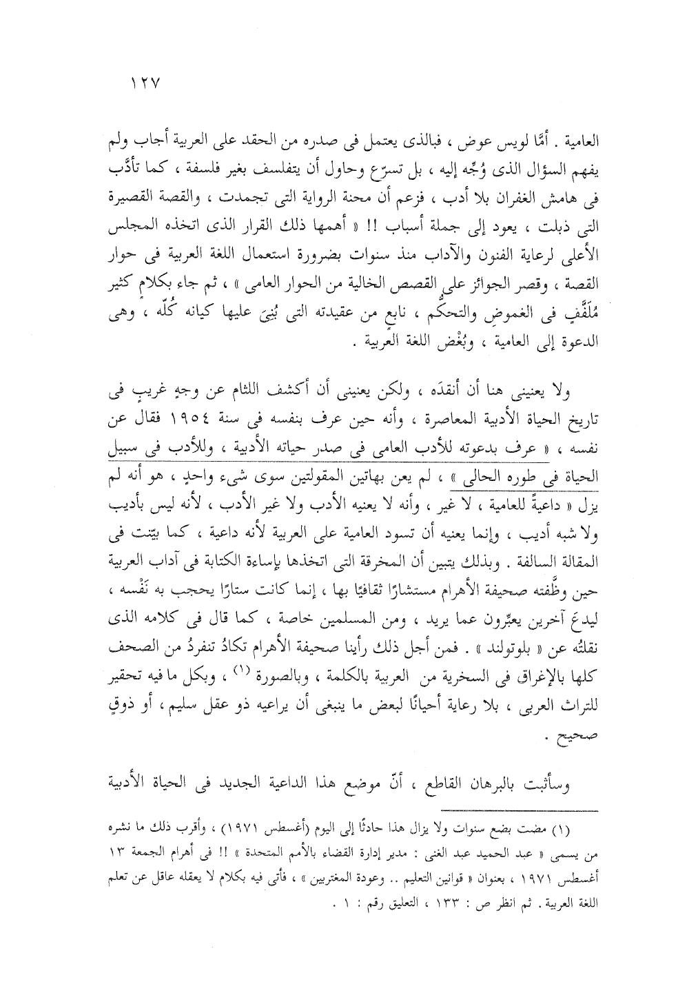 (1) مضت بضع سنوات ولا يزال هذا حادثا إلى اليوم (أغسطس 1971)، وأقرب ذلك ما نشره من يسمى "عبد الحميد عبد الغني" مدير إدارة القضاء بالأمم المتحدة"!! في أهرام الجمعة 13 أغسطس 1971، بعنوان "قوانين التعليم .. وعودة المغتربين"، فأتي فيه بكلام لا يعقله عاقل عن تعلم اللغة العربية. ثم انظر ص: 133، التعليق رقم: 1.