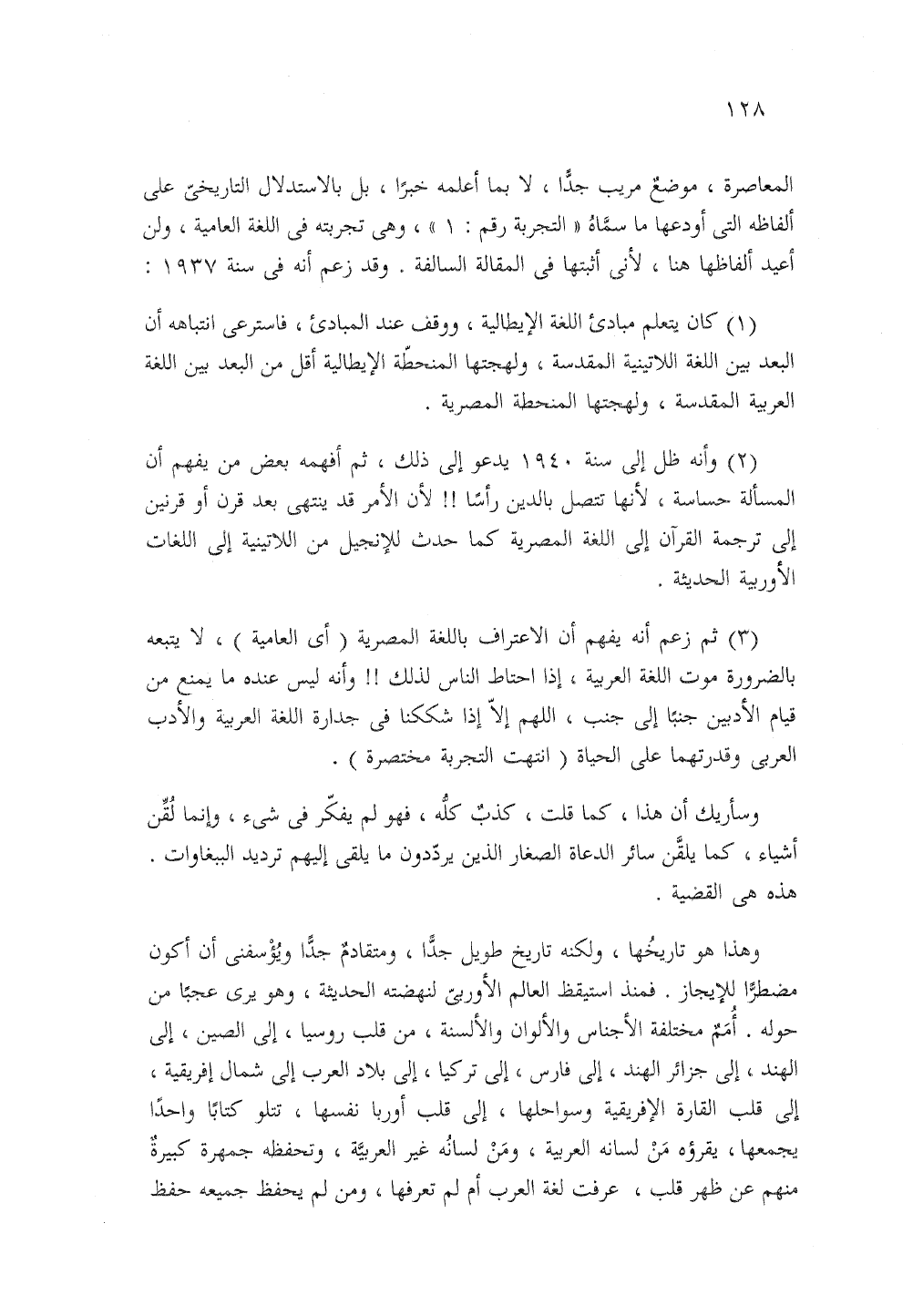 2 - وأنه ظل إلى سنة 1940 يدعو إلى ذلك ثم أفهمه بعض من يفهم أن المسألة حساسة لأنها تتصل بالدين رأسا لأن الأمر ثد ينتهي بعد قرن أو قرنين إلى ترجمة القرآن إلى اللغو المصرية كما حدث للإنجيل من اللاتينية إلى اللغات الأوروبية الحديثة