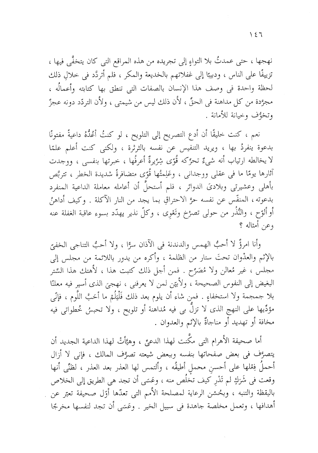 وأنا امرؤ لا أحب الهمس والدندنة في الآذان سرا ولا أحب التناجي الخفي بالإثم والعدوان تحت ستار الظلمة وأكره من يدور باللائمة من مجلس إلى مجلس غير معالن ولا مصرح فمن أجل ذلك كتبت هذا لأهتك هذا الستر البغيض إلىت النفوس الصحيحة ولأبين لما لا يعرفني نهجي الذي أسير فيه معلنا بلا جمجمة ولا استخفاء فمن شاء أن يلوم بعد ذلك فليلم ما أحب اللوم فإني مؤديها على النهج الذي لا تزل بي فيه مداهنة أو تلويح ولا تحبس خطواتي فيه مخافة أو تهديد أو مناجاة بالإثم والعدوان.