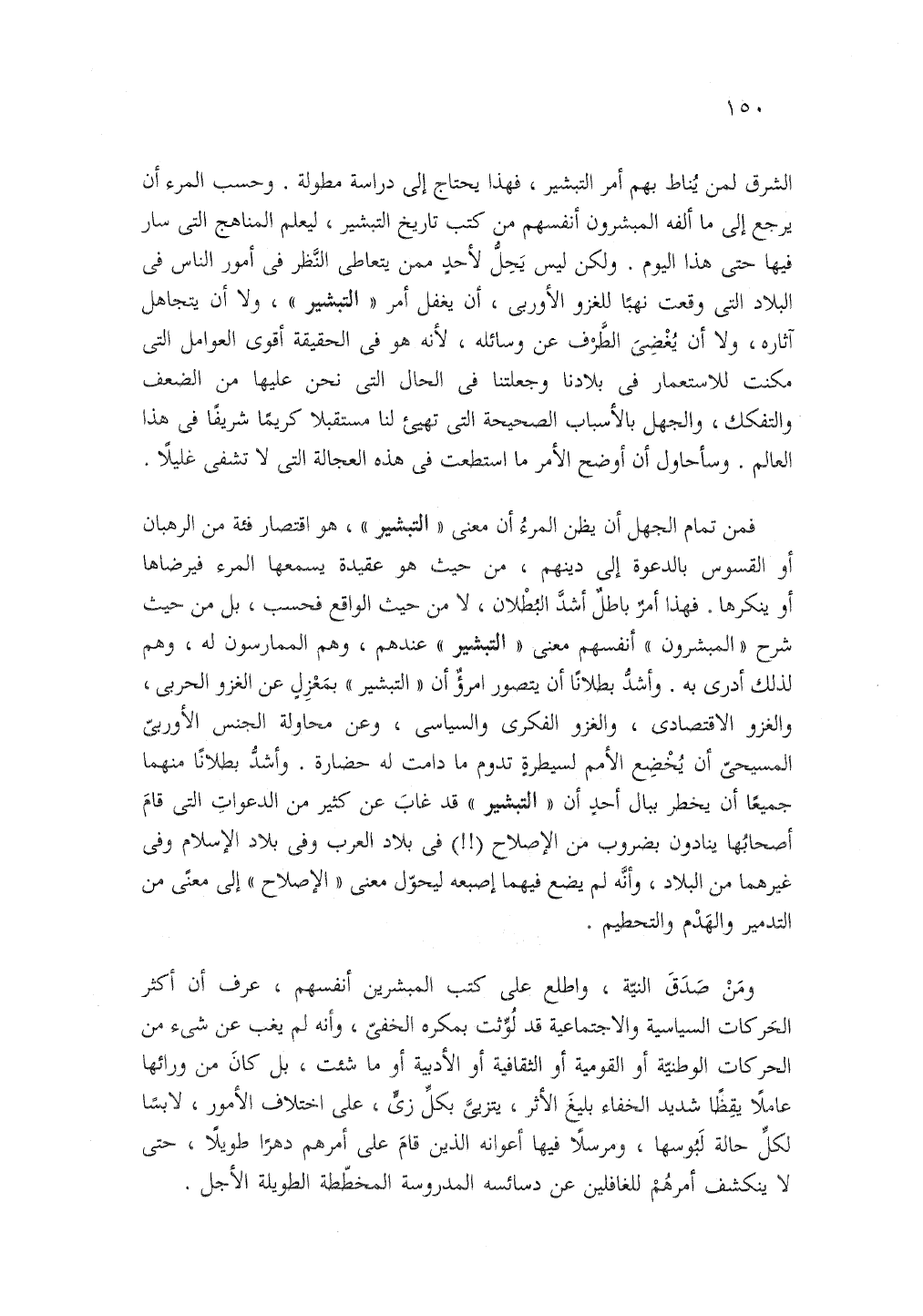 فمن تمام الجهل أن يظن المرء أن معنى التبشير هو اقتصار فئة من الرهبان أو القسوس بالدعوة إلى دينهم من حيث هو عقيدة يسمعها المرء فيرضاها أو ينكرها فهذا أمر باطل أشد البطلان لا من حيث الواقع فحسب بل من حيث شرح المبشرون أنسهم معنى التبشير عندهم وهم الممارسون له وهم لذلك أدرى به وأشد بطلانا أن يتصور امرؤ أن التبشير بمعزل عن الغزو الحربي والغزو الاقتصادي والغزو الفكري والسياسي وعن محاولة الجنس الأوروبي المسيحي أن ضخع الأمم لسيطرة تدوم ما دامت له حضارة وأشد بطلانا منهما جميعا أن يخطر ببال أحد أن التبشير قد غاب عن كثير من الدعوات التي قام أصحابها ينادون بضروب من الإصلاح في بلاد العرب وفي بلاد الإسلام وفي غيرهما من البلاد وأنه لم يضع فيهما إصبعه ليحول معنى الإصلاح إلى معنى من التدمير والهدم والتحطيم.