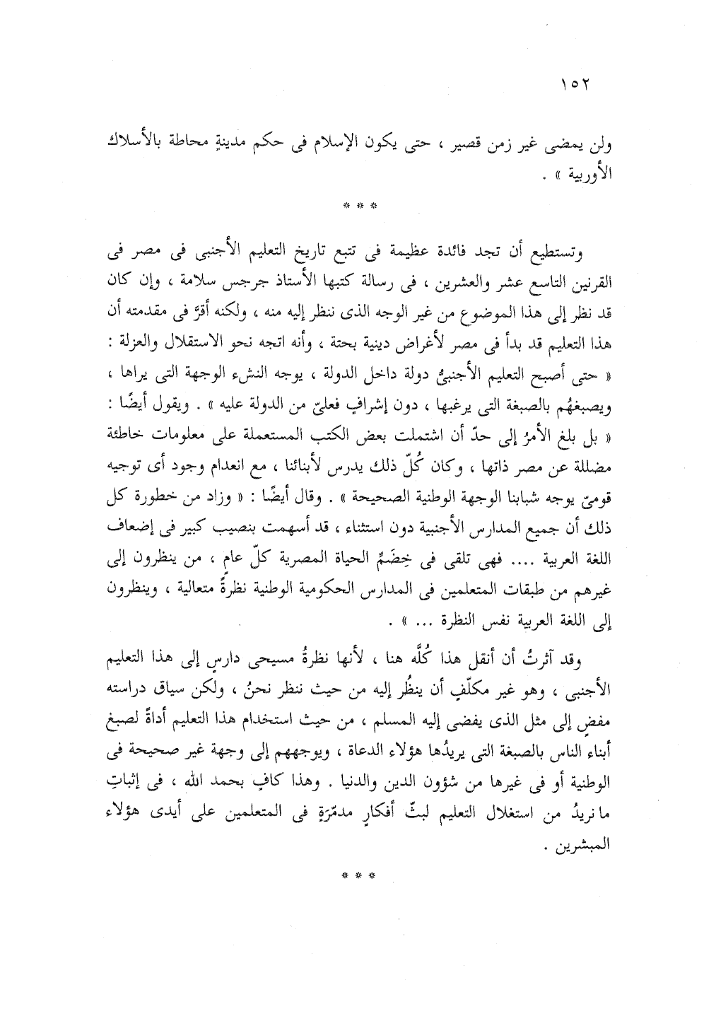 وقد أثرت أن أنقل هذا كله هنا لأنها نظرة مسيحي دارس إلى هذا التعليم الأجنبي وهو غير مكلف أن ينظر إليه من حيث ننظر نحن ولكن سياق دراسته مفض إلى مثل الذي يفضي إليه المسلم من حيث استخدامه هذا التعليم أداة لصبغ أبناء الناس بالصبغة التي يريدها هؤلاء الدعاة ويوجههم إلى وجهة غير صحيحة في الوطنية أو في غيرها من شؤون الدين والدنيا وهذا كاف بحمد الله في إثبات ما نريد من استغلال التعليم لبث أفكاره مدمرة في المتعلمين على أيدي هؤلاء المبشرين.