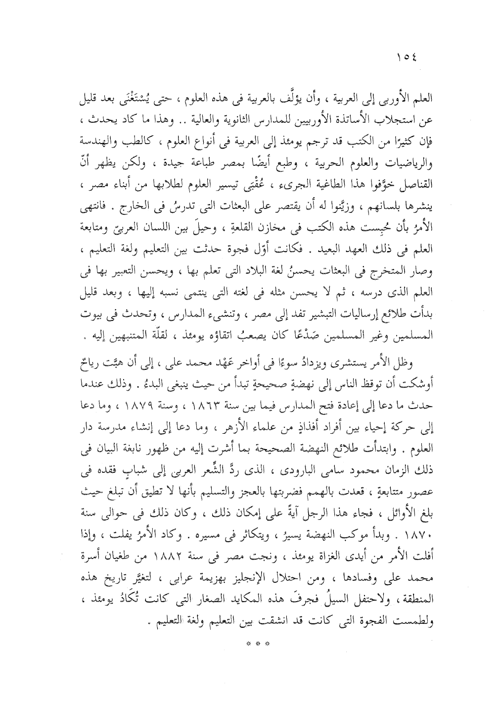 وظل الأمر يستشري ويزداد سوءا في أواخر عهد محمد عليّ إلى أن هبت رياح أوشكت أن توقظ الناس إلى نهضة صحيحة تبدأ من حيث ينبغي البدء وذلك عندما حدث ما دعا إلى إعادة فتح المدارس فيما بين سنة 1863 وسنة 1879 وما دعا إلى حركة إحياء بين أفراد أفذاذ من علماء الأزهر وما دعا إلى إنشاء مدرسة دار العلوم وابتدأت طلائع النهضة الصحيحة بما أشرت إليه من ظهور نابغة البيان في ذلك الزمان محمود سامني البارودي الذي رد الشعر العربي إلى شباب فقده في عصور متتابعة قعدت بالهمم فضربتها بالعجز والتسليم بأنها لا تطيق أن تبلغ حيث بلغ الأوائل فجاء هذا الرجل آية على إمكان ذلك وكان ذلك في حوالي سنة 1870 وبدأ موكب النهضة يسير ويتكاثر في مسيره وكاد الأمر يفلت وإذا أفلت الأمر من أيدي الغزاة يومئذ ونجت مصر في سنة 1882 من طغيان أسرة محمد عليّ وفسادها ومن احتلال الإنجليز بهزيمة عرابي لتغير تاريخ هذه المنطقة ولاحتفل السيل فجرف هذه المكايد الصغار التي كانت تكاد يومئذ ولطمست الفجوة التي كانت قد انشقت بين التعليم ولغة التعليم.