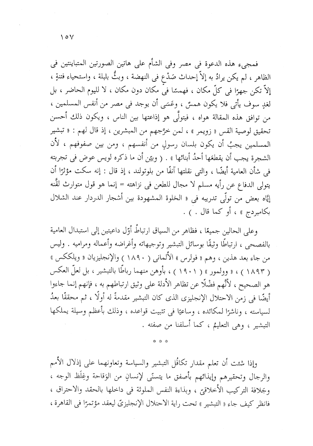 وعلى الحالين جميعا فظاهر من السياق ارتباط أول داعيتين إلى استبدال العامية بالفصحى ارتباطا وثيقا بوسائل التبشير وتوجيهاته وأغراضه وأعماله ومراميه وليس من جاء بعد هذين وهو فولرس الألماني 1890 وافنجليزيان ويلككس 1893 وولمور 1901 بأوهن منهما رباطا بالتبشير بل لعل العكس هو الصحي لأنهم فضلا عن تظاهر الأدلة على توثيق ارتباطهم به فإنهم إنما جاءوا أيضا في زمن الاحتلال الإنجليزي الذي كان التبشير مقدمة له أولا ثم محققا بعد لسياسته وناشر لمكائده وساعيا في تثبيت قواعده وذلك بأعظم وسيلة يملكها التبشير وهي التعليم كما أسلفنا من صفته.