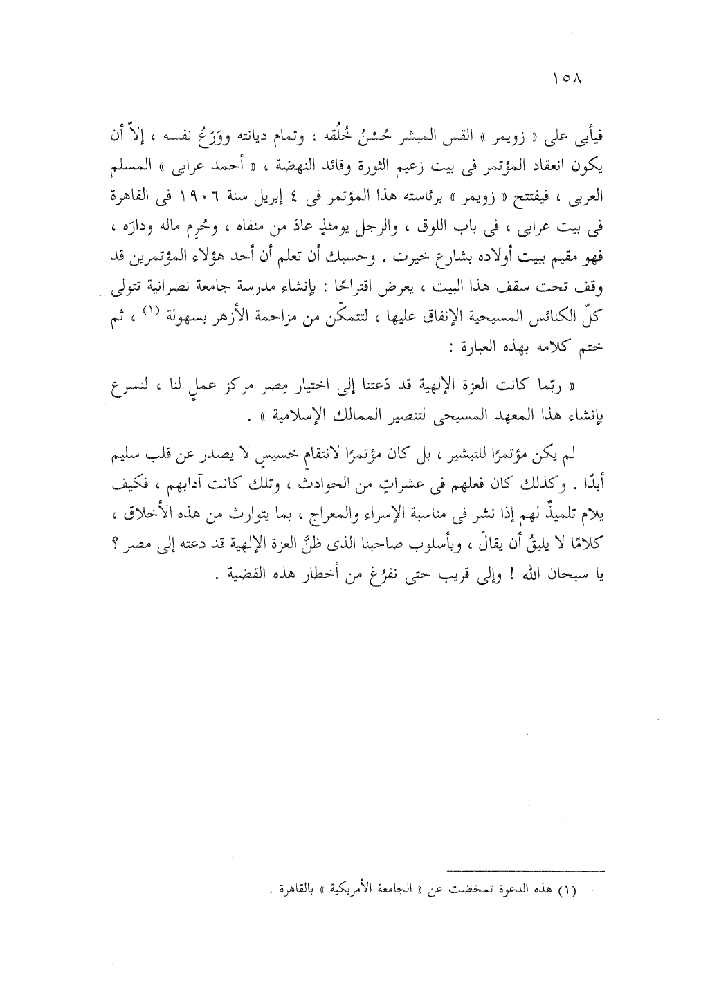 فيأبي على زويمر القس المبشر حسن خلقه وتمام ديانته وروع نفسه إلا أن يكون انعقاد المؤتمر في بيت زعيم الثورة وقائد النهضة أحمد عرابي المسلم العربي فيفتح زويمر برئاسته هذا المؤتمر في 4 إبريل سنة 1906 في القاهرة في بيت عرابي في باب اللوق والرجبل يومئذ عاد من منفاه وحرم ماله وداره فهو مقيم ببيت أولاده بشارع خيرت وحسبك أن تعلم أن أحد هؤلاء المؤتمرين قد وقف تحت سقف هذا البيت يعرض اقتراحا بإنشاء مدرسة جامعة نصرانية تتولى كل الكنائس المسيحية الإنفاق عليها لتتمكن من مزاحمة الأزهر بسهولة (1)، ثم ختم كلامه بهذه العبارة: