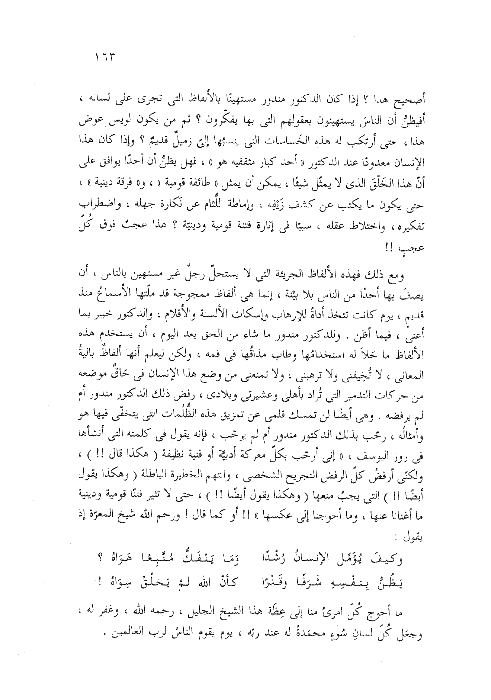 أصحيح هذا إذا كان الدكتور مندور مستهينا بالألفاظ التي تجري على لسانه أفيظن أن الناس يستهينون بعقولهم التي بها يفكرون ثم من يكون لويس عوض هذا حتى أرتكب له هذه الخساسات التي ينسبها إلى زميل قديم وإذا كان هذا الإنسان معدودا عند الدكتور أحد كبار مثقفيه هو فهل يظن أن أحد يوافق على أن هذا الخلق الذي لا يمثل شيئا يمكن أن يمثل طائفة قومية وفرقة دينية حتى يكون ما يكتب عن كشف زيفه وإماطة اللثام عن نطارة جهله واضطراب تفكيره واختلاط عقله سببا في إثارة فتنة قومية ودينية هذا عجب فوق كل عجب!!