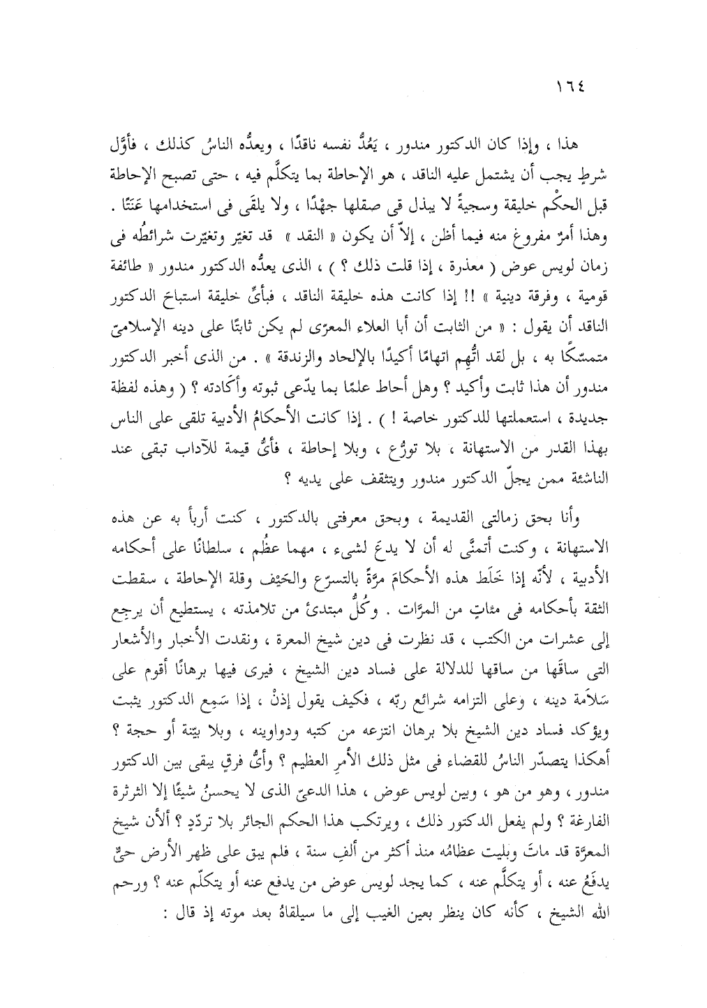 هذا وإذا كان الدكتور مندور يعد نفسه ويعده الناس كذلك فأول شرط يجب أن يشتمل عليه الناقد هو افحاطة بما يتكلم فيه حتى تصبح الإحاطة قبل الحكم خليفة وسجية لا يبذل في صقلها جهدا ولا يلقي في استخدامها عنتا وهذا أمر مفروغ منه فيما أظن إلا أن يكون النقد قد تغير وتغيرت شرائطه في زمان لويس عوض معذرة إذا قلت ذلك الذي يعده الدكتور مندور طائفة قومية وفرقة دينية إذا كانت هذه خليقة الناقد فبأي خليقة استباح الدكتور الناقد أن يقول من الثابت أن أبا العلاء المعري لم يكن ثابتا على دينه الإسلامي متمسكا به بل لقد اتهم اتهاما أكيد بالإلحاد والزندقة من الذي أخبر الدكتور مندور أن هذا ثابت وأكيد وهل أحاط علما بما يدعي ثبوته وأكادته وهذه لفظة جديدة استعملتها للدكتور خاصة إذا كانت الأحكام الأدبية تلقي على الناس بهذا القدر من الاستهانة بلا تورع وبلا إحاطة فأي قيمة للاداب تبقى عند الناشئة ممت يجل الدكمتور مندور ويتثقف على يديه؟