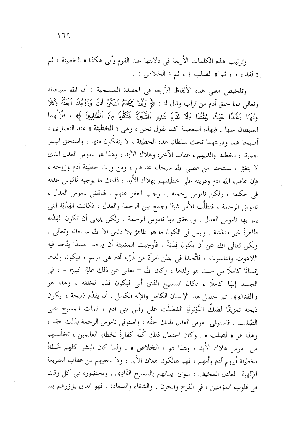 وتلخيص معنى هذه الألفاظ الأربعة في العقيدة المسيحية أن الله سبحانه وتعالى لما خلق آدم من تراب وقال له: {وَقُلْنَا يَاآدَمُ اسْكُنْ أَنْتَ وَزَوْجُكَ الْجَنَّةَ وَكُلَا مِنْهَا رَغَدًا حَيْثُ شِئْتُمَا وَلَا تَقْرَبَا هَذِهِ الشَّجَرَةَ فَتَكُونَا مِنَ الظَّالِمِينَ (35) فَأَزَلَّهُمَا الشَّيْطَانُ عَنْهَا} [البقرة: 35، 36] فبهذه المعصية كما نقول نحن وهي الخطيئة عند النصارى أصبحا هما وذريتهما تحت سلطان هذه الخطيئة لا ينفكون منها واستحق البشر جميعا بخطيئة والديهم عقاب الآخرة وهلاك الأبد وهذا هو ناموس العدل الذي لا يتغير يستحقه من عصى الله سبحانه عندهم ومن ورث خطيئة آدم وزوجه فإن عاقب الله آدم وذريته على خطيئتهم بهلاك الأبد فذلك ما يوجبه ناموس عدله في حكمه ولكن ناموس رحمته يستوجب العفو عنهم فناقض ناموس العدل ناموس الرحمة فتطلب الأمر شيئا يجمع بين الرحمة والعدل فكانت الفدية التي يتم بها ناموس العدل ويتحقق بها ناموس الرحمة ولكن ينبغي أن تكون الفدية طاهرة غير مدنسة وليس في الكون ما هو طاهر بلا دنس إلا الله سبحانه وتعالى ولكن تعالى الله عن أن يكون فدية فأوجبت المشيئة أن يتخذ جسدا يتحد فيه اللاهوت والناسوت فاتحدا في بطن امرأة من ذرية آدم هي مريم فيكون ولدها إنسانا كاملا من حيث هو ولدها وكان الله = تعالى عن ذلك علوا كبيرا = في الجسد إلها كتاملا فكان المسيح الذي أتى ليكون فدية لخلقه وهذا هو الفداء ثم احتمل هذا الإنسان الكامل والإله الكامل أن يقدم ذبيحة ليكون ذبحه تمزيقا لصك الدينونة المصلت على رأس بني آدم فمات المسيح على الصليب فاستوفى ناموس العدل بذلك حقه واستوفى ناموس الرحمة بذلك حقه وهذا هو الصلب وكان احتمال ذلك كله كفارة لخطايا العالمين تخلصهم من ناموس هلاك الأبد وهذا هو الخلاص ولما كان البشر كلهم خطاة بخطيئة أبيهم آدم وأمهم فهم هالكون هلاك الأبد ولا ينجيهم من عقاب الشريعة الإلهية العادل المخيف سوى إيمانهم بالمسيح الفادي وبحضوره في كل وقت في قلوب المؤمنين في الفرح والحزن والشقاء والسعادة فهو الذي يؤازرهم بما