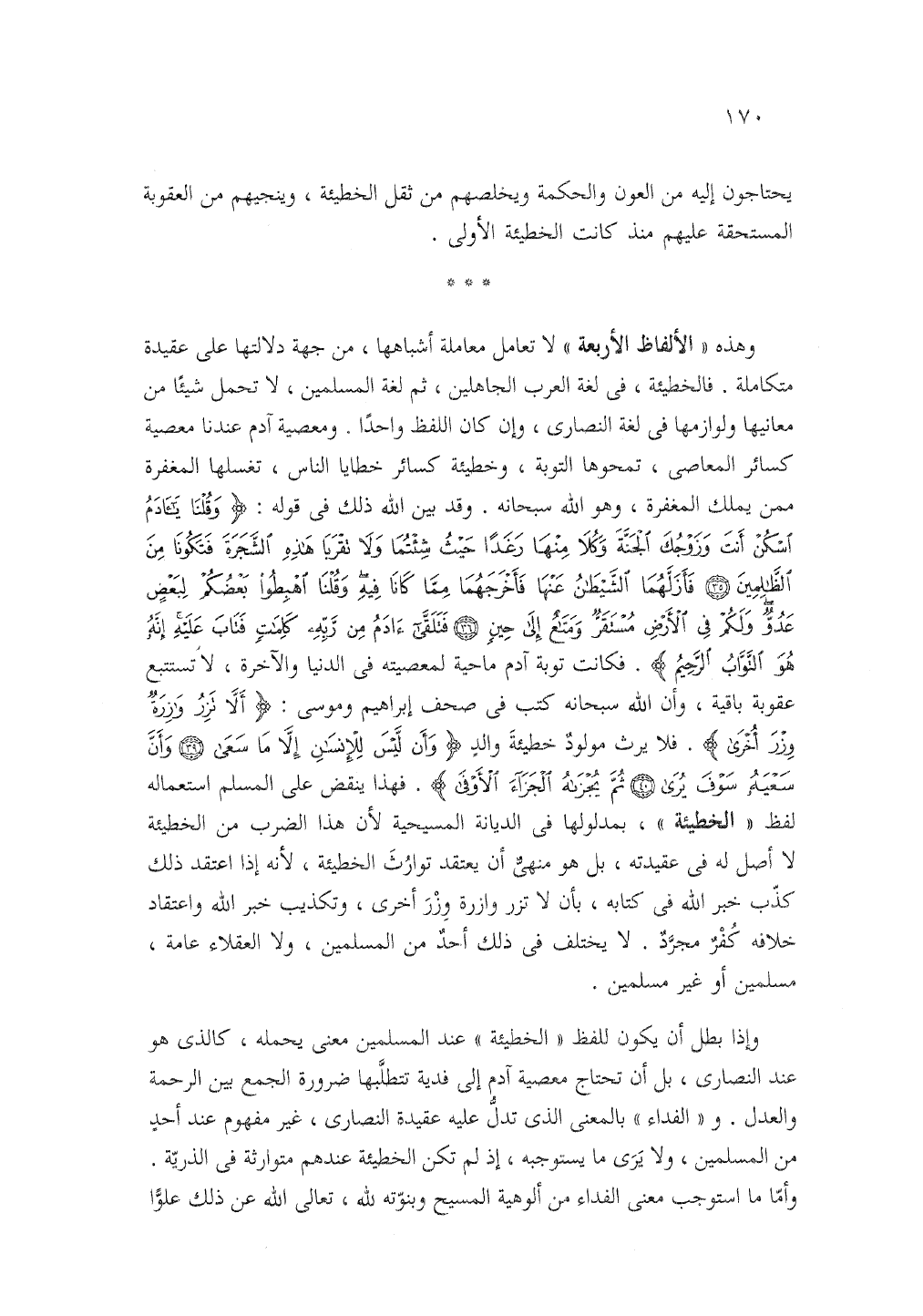 وهذه الألفاظ الأربعة لا تعامل معاملة أشباهها من جهة دلالتها على عقيدة متكاملة فالخطيئة في لغة العرب الجاهلين ثم لغة المسلمين لا تحمل شيئا من معانيها ولوازمها في لغة النصارى وإن كان اللفظ واحدا ومعصية آدم عندنا معصية كسائر المعاصي تمحوها التوبة وخطيئة كسائر خطايا الناس تغسلها المغفرة ممن يملك المغفرة وهو الله سبحانه وقد بين الله ذلك في قوله: {وَقُلْنَا يَاآدَمُ اسْكُنْ أَنْتَ وَزَوْجُكَ الْجَنَّةَ وَكُلَا مِنْهَا رَغَدًا حَيْثُ شِئْتُمَا وَلَا تَقْرَبَا هَذِهِ الشَّجَرَةَ فَتَكُونَا مِنَ الظَّالِمِينَ (35) فَأَزَلَّهُمَا الشَّيْطَانُ عَنْهَا فَأَخْرَجَهُمَا مِمَّا كَانَا فِيهِ وَقُلْنَا اهْبِطُوا بَعْضُكُمْ لِبَعْضٍ عَدُوٌّ وَلَكُمْ فِي الْأَرْضِ مُسْتَقَرٌّ وَمَتَاعٌ إِلَى حِينٍ (36) فَتَلَقَّى آدَمُ مِنْ رَبِّهِ كَلِمَاتٍ فَتَابَ عَلَيْهِ إِنَّهُ هُوَ التَّوَّابُ الرَّحِيمُ (37)} [البقرة: 35 - 37] فكانت توبة آدم ماحية لمعصيته في الدنيا والآخرة لا تستطيع عقوبة باقية وأن الله سبحانه كتب في صحف إبراهيم وموسى: (أَلَّا تَزِرُ وَازِرَةٌ وِزْرَ أُخْرَى) فلا يرث مولود خطيئة والد {وَأَنْ لَيْسَ لِلْإِنْسَانِ إِلَّا مَا سَعَى (39) وَأَنَّ سَعْيَهُ سَوْفَ يُرَى (40) ثُمَّ يُجْزَاهُ الْجَزَاءَ الْأَوْفَى (41)} [النجم: 39 - 41] فهذا ينقض على المسلم استعماله لفظ الخطيئة بمدلولها في الديانة المسيحية لأن هذا الضرب من الخطيئة لا أصل له في عقيدته بل هو منهى أن يعتقد توارث الخطيئة لأنه إذا اعتقد ذلك كذب خبر الله في كتابه بأن لا تزر وازرة وزر أخرى وتكذيب خبر الله واعتقاد خلافه كفر مجرد لا يختلف في ذلك أحد من المسلمين ولا العقلاء عامة مسلمين أو غير مسلمين.