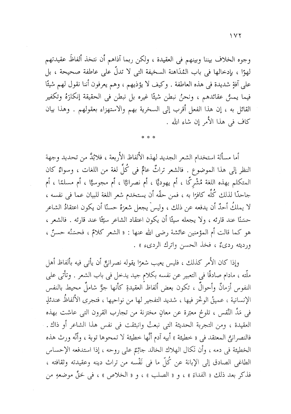 وإذا كان الأمر كذلك فليس يعيب شعرا يقوله نصراني أن يأتي فيه بألفاظ أهل ملته ما دام صادقا في التعبير عن نفسه بكلام جيد يدخل في باب الشعر وتأتي على النفوس أزمان وأحوال تكون بعض ألفاظ العقيدة كأنها جو شامل محيط بالنفس الإنسانية عميق الوخز فيها شديد التفجير لها من نواحيها فتجري الألفاظ عندئذ في مد النفس تلوح معبرة عن معان مختزنة من تجارب القرون التي عاشت بهذه العقيدة ومن التجربة الحديثة التي نبعت وانبثقت في نفس هذا الشاعر أو ذاك فالنصراني المعتقد في خطيئة أبيه آدم أنها خطيئة لا تمحوها توبة وأنه ورث هذه الخطيئة في دمه وأن نكال الهلاك الخالد جاثم على روحه إذا استدفعه الإحساس الطاغي الصادق إلى الإبانة عن كل ما في نفسه من تراث دينه وعقيدته وثقافته فذكر بعد ذلك الفداء والصلب والخلاص في حق موضعه من