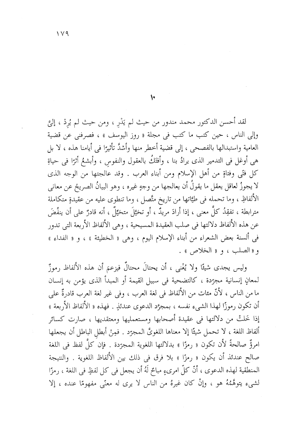 لقد أحسن الدكتور محمد مندور من حيث لم يدر ومن حيث لم يرد إلى وإلى الناس حين كتب ما كتب في مجلة روز اليوسف فصرفني عن قضية العامية واستبدالها بالفصحى إلى قضية أخطر منها وأشد تأثيرا في أيمنا هذه لا بل هي أوغل في التدمير الذي يراد بنا وأفتك بالعقول والنفوس وأبشع أثرا في حياة كل فتى وفتاة من أهل الإسلام ومن أبناء العرب وقد عالجتها من الوجه الذي لا يجوز لعاقل يعقل ما يقول أن يعالجها من وجه غيره وهو البيان الصريح عن معاني الألفاظ وما تحمله في طياتها من تاريخ متصل وما تنطوي عليه من عقيدة متكاملة مترابطة تفقد كل معنى إذا أراد مريد أو تخيل متخيل أنه قادر على أن ينفض عن هذه الألفاظ دلالتها في صلب العقيدة المسيحية وهي الألفاظ الأربعة التي تدور في ألسنة بعض الشعراء من أبناء الإسلام اليوم وهي الخطيئة والفداء والصلب والخلاص.