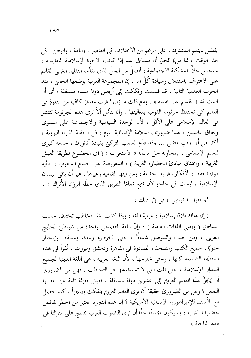 بفضل دينهم المشترك على الرغم من الاختلاف في العنصر واللغة والوطن في هذا الوقت لنا ملء الحق أن نتساءل عما إذا كانت الأخوة الإسلامية التقليدية ستحمل حلا للمشكلة الاجتماعية أفضل من الحل الذي يقدمه التقليد الغربي القائم على الاعتراف باستقلال وسيادة كل أمة إن المجموعة الغربية بوضعها الحالي منذ الحرب العالمية الثانية قد قسمت وفككت إلى أربعين دولة سيدة مستقلة أي أن البيت قد انقسم على نفسه ومع ذلك ما زال للغرب مقدار كاف من الفنوذ في العالم كي تحتفظ جرثومة القومية بفعاليتها وإنا لنأمل ألا نرى هذه الجرثومة تنتشر في العالم الإسلامي على الأقل لأن الوحدة السياسية والاجتماعية على مستوى ونطاق عالميين هما ضرورتان لسلامة الإنسانية اليوم وفي الحقبة الذرية النووية أكثر من أي وقت مضى وقد قدم الشعب التركي بقيادة أتاتورك خدمة كبرى للعالم الإسلامي بمحاولة حل مسألة الاستغراب أي لخضوع لطريقة العيش الغربية واعتناق مبادئ الحضارة الغربية المعروضة على جميع الشعوب بتبنيه دون تحفظ الأفكار الغربية الحديثة ومن بينها القومية وغيرها غير أن باقي البلدان الإسلامية ليست في حاجة لأن تتبع تماما الطريق الذي خطه الرواد الأتراك.