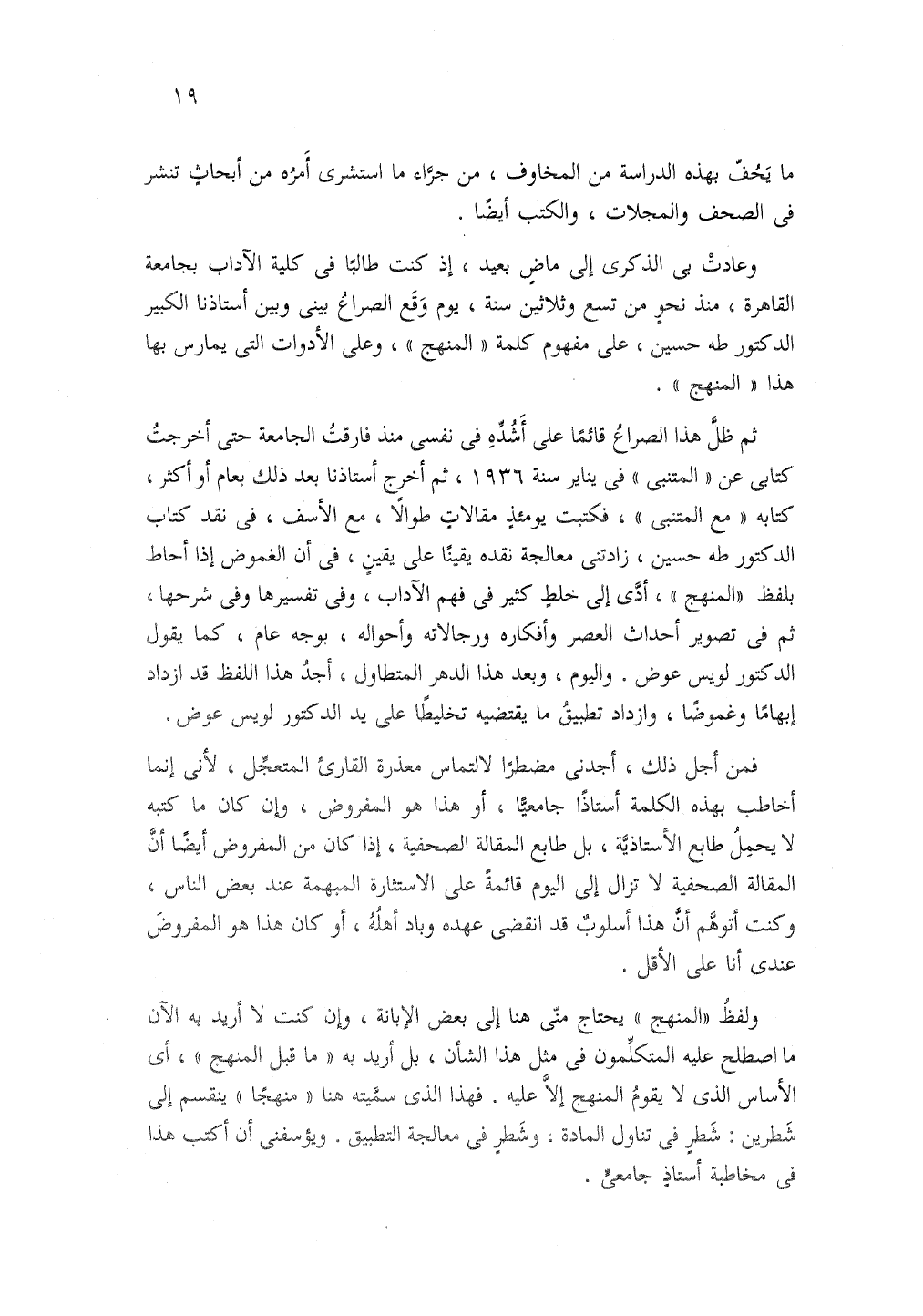 ثم ظل هذا الصراع قائما على أشده في نفسي منذ فارقت الجامعة حتى أخرجت كتابي عن المتنبي في يناير سنة 1936 ثم أخرج أستاذنا بعد ذلك بعام أو أكثر كتابه مع المتنبي فكتبت يومئذ مقالات طوالا مع الأسف في نقد كتاب الدكتور طه حسين زادتني معالجة نقده يقينا على يقين في أن الغموض إذا أحاط بلفظ المنهج أدى إلى خلط كثير في فهم الآداب وفي تفسيرها وفي شرحها ثم في تصوير أحداث العصر وأفكاره ورجالاته وأحواله بوجه عام كما يقول الدكتور لويس عوض واليوم وبعد هذا الدهر المتطأول أجد هذا اللفظ قد ازداد إبهاما وغموضا وازداد تطبيق ما يقتضيه تخليطا على يد الدكتور لويس عوض.